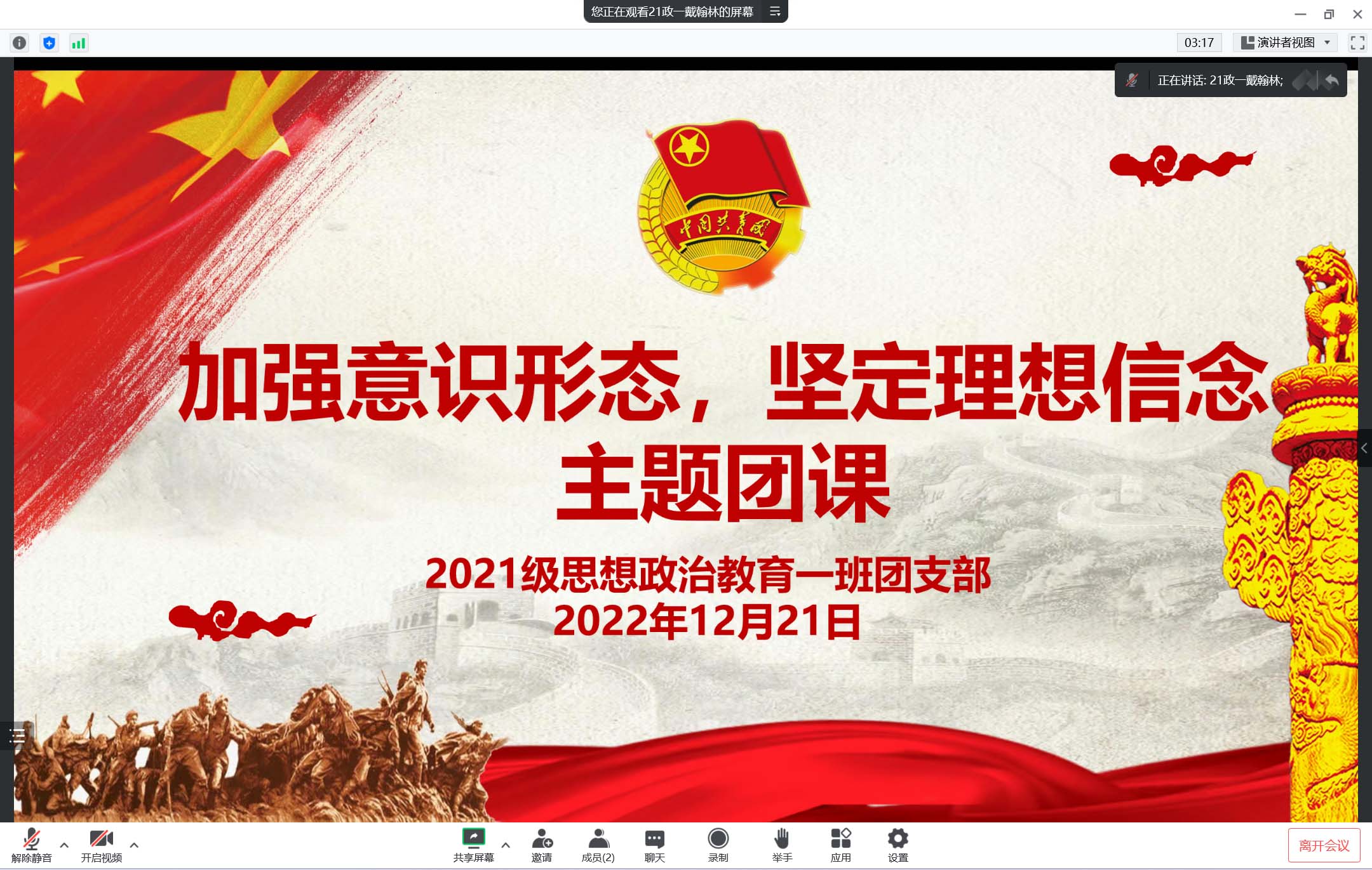 12月21日下午,sjb世俱杯网站2021级思想政治教育一班在腾讯会议召开线上“加强意识形态,坚定理想信念”主题团课。2021级思想政治教育一班全体团员参加了本次团课。团课由团支书戴翰林主持。