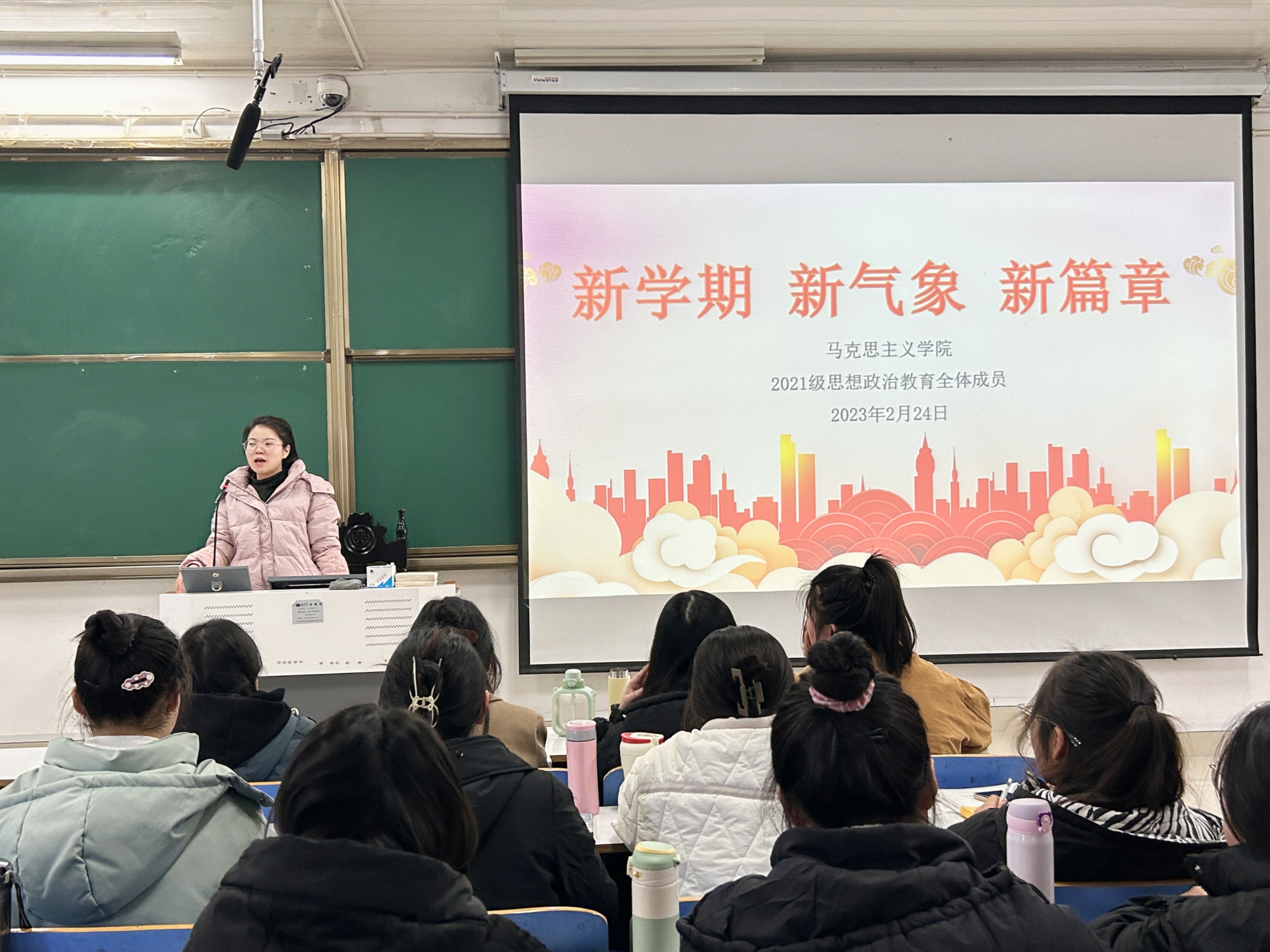2月24日下午,sjb世俱杯网站2021级思想政治教育一班、二班在社科楼514教室召开“新学期、新气象、新篇章”主题班会。辅导员高小佳以及2021级思想政治教育全体成员共同参加本次班会。班会由辅导员高小佳主持。
