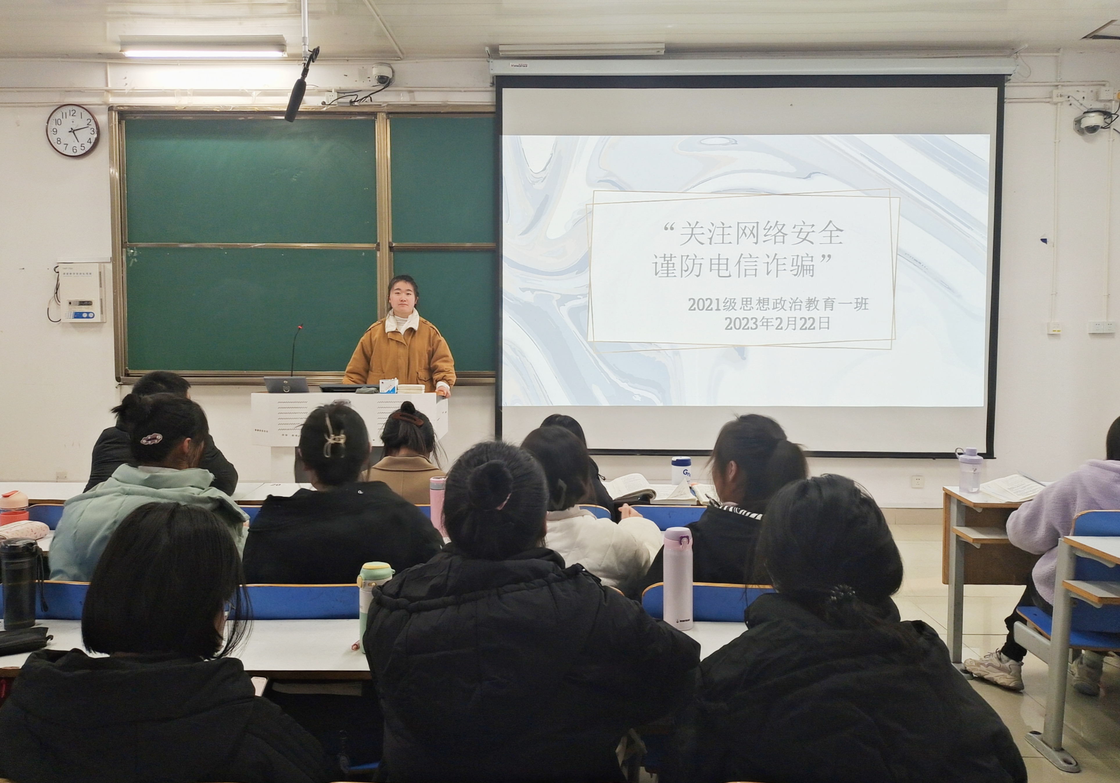 为进一步提高同学们对电信网络诈骗的防范意识,增强防范网络诈骗能力。2月22日下午,sjb世俱杯网站2021级思想政治教育一班在社科楼514教室召开“关注网络安全,谨防电信诈骗”主题班会。2021级思想政治教育一班全体成员共同参加本次班会。班会由副班长雷敏主持。