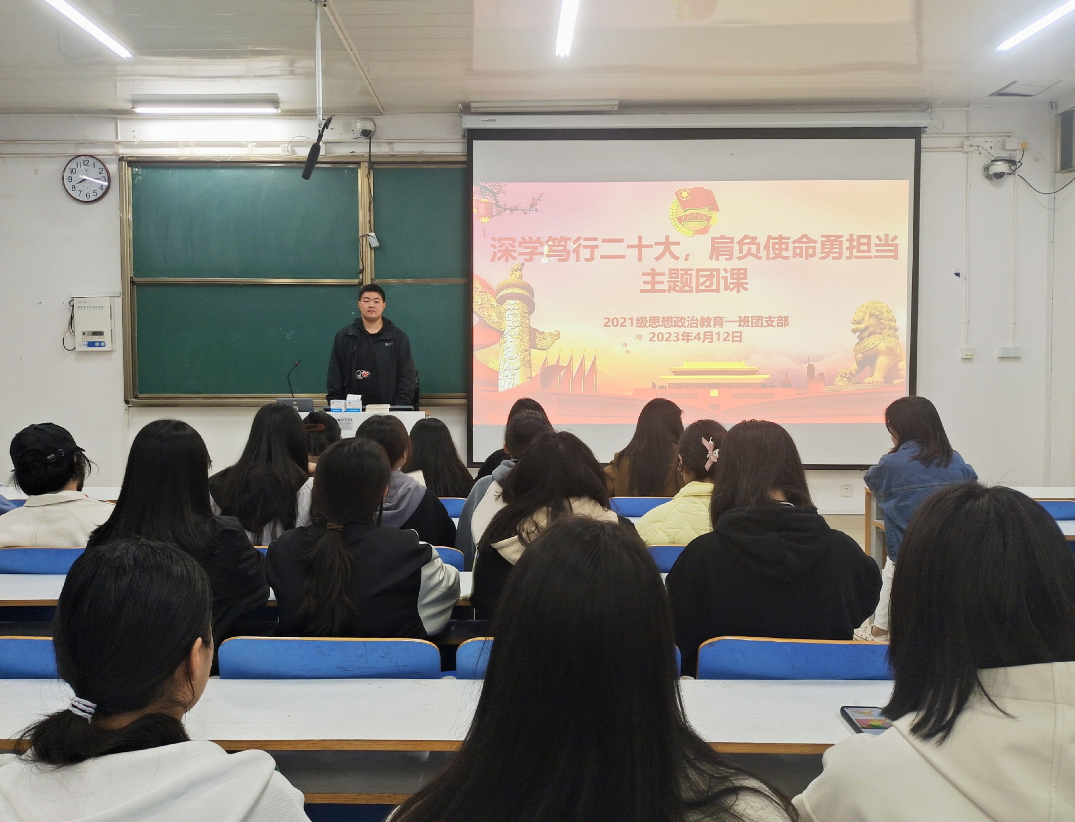 为强化对青年团员的思想政治引领,引导动员青年团员学习党的二十大精神,坚定跟党走,建功新时代,4月12日晚上,sjb世俱杯网站2021级思想政治教育一班在社科楼514教室召开“学习笃行二十大,肩负使命勇担当”主题团课。2021级思想政治教育一班全体团员参加了本次团课。团课由团支书戴翰林主持。