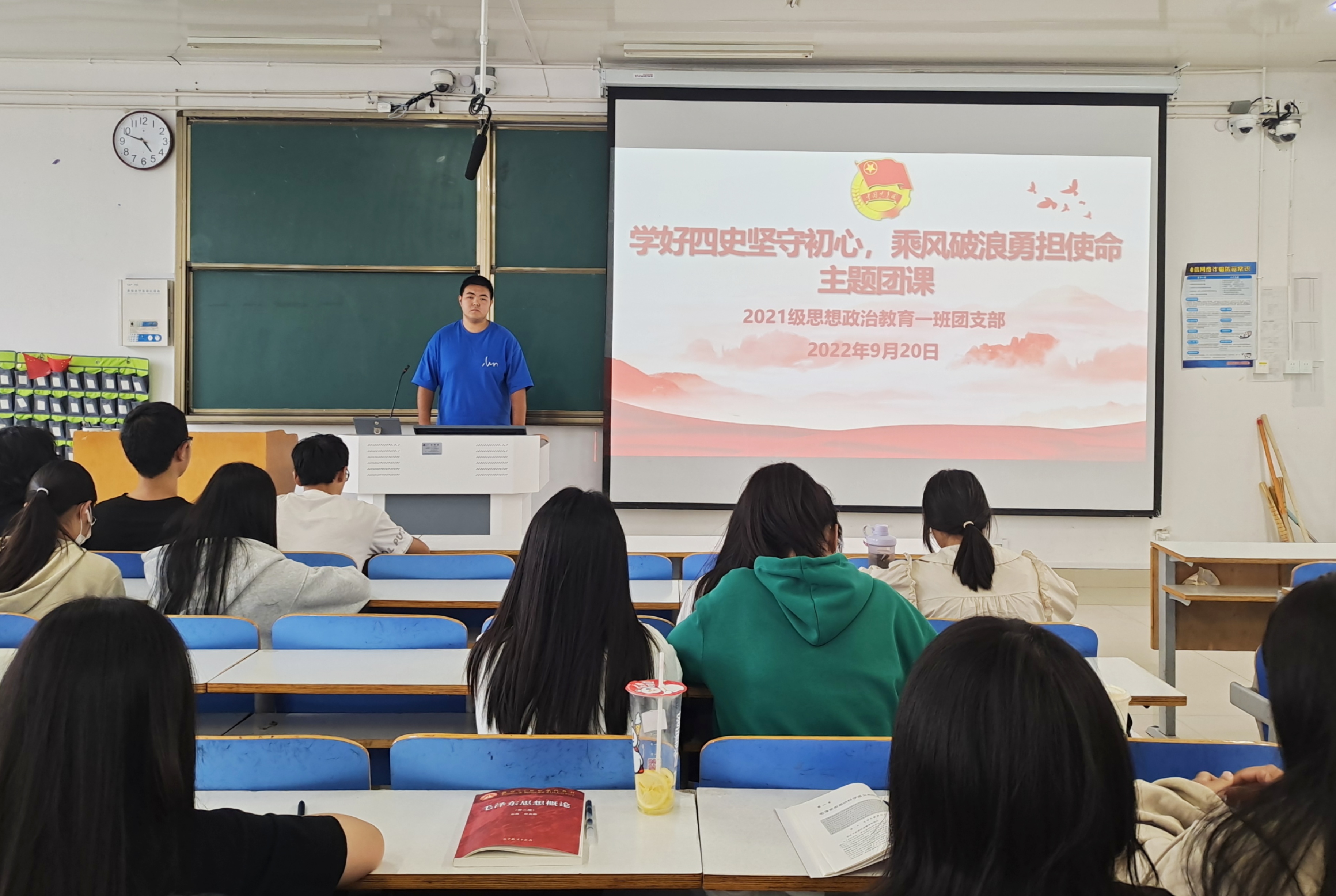 9月20日下午,sjb世俱杯网站2021级思想政治教育一班在社科楼514教室召开“学好四史坚守初心,乘风破浪勇担使命”主题团课。2021级思想政治教育一班全体团员共同参加了本次团课,团课由团支书戴翰林主持。