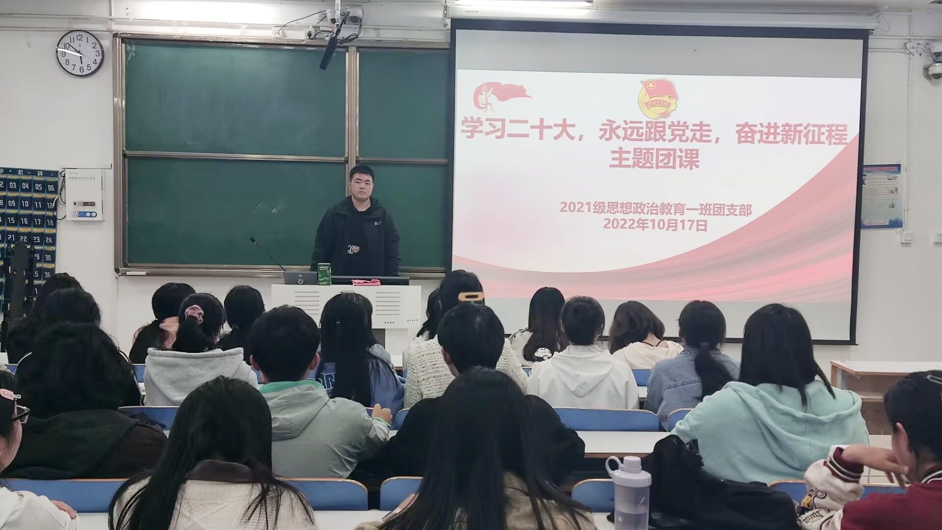 10月17日下午,sjb世俱杯网站2021级思想政治教育一班在社科楼514教室召开“学习二十大,永远跟党走,奋进新征程”主题团课。2021级思想政治教育一班全体团员共同参与本次团课。团课由团支书戴翰林主持。