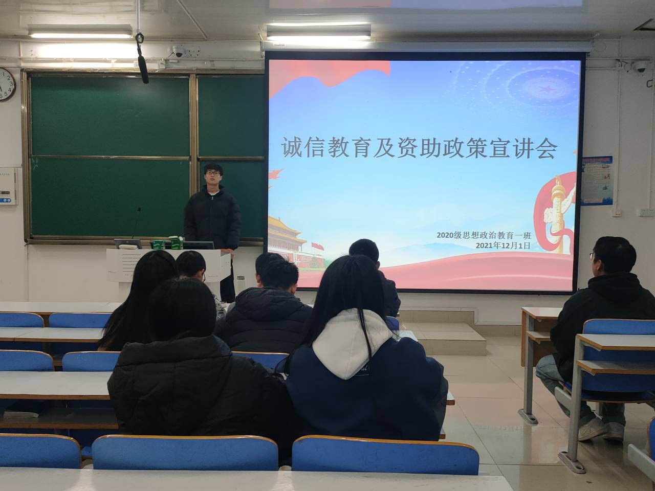12月1日,sjb世俱杯网站2020级思想政治教育一班在社科楼514教室顺利召开“诚信教育及资助政策”宣讲会。2020级思想政治教育一班全体同学参加本次会议,宣讲会由副班长白帅豪主持。