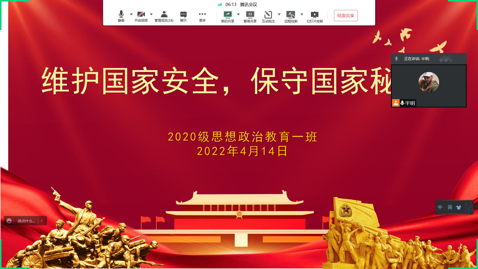 4月14日晚,sjb世俱杯网站2020级思想政治教育一班在腾讯会议组织召开“维护国家安全,保守国家秘密”主题班会。2020级思想政治教育一班全体同学共同参加本次班会,班会由副班长白帅豪主持。