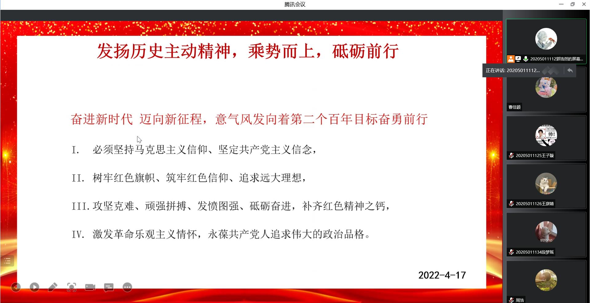 4月17日下午,sjb世俱杯网站2020级思想政治教育一班在腾讯会议上开展“喜迎二十大”主题团课。2020级思想政治教育一班全体同学共同参与本次团课,会议由组织委员郭浩然主持。