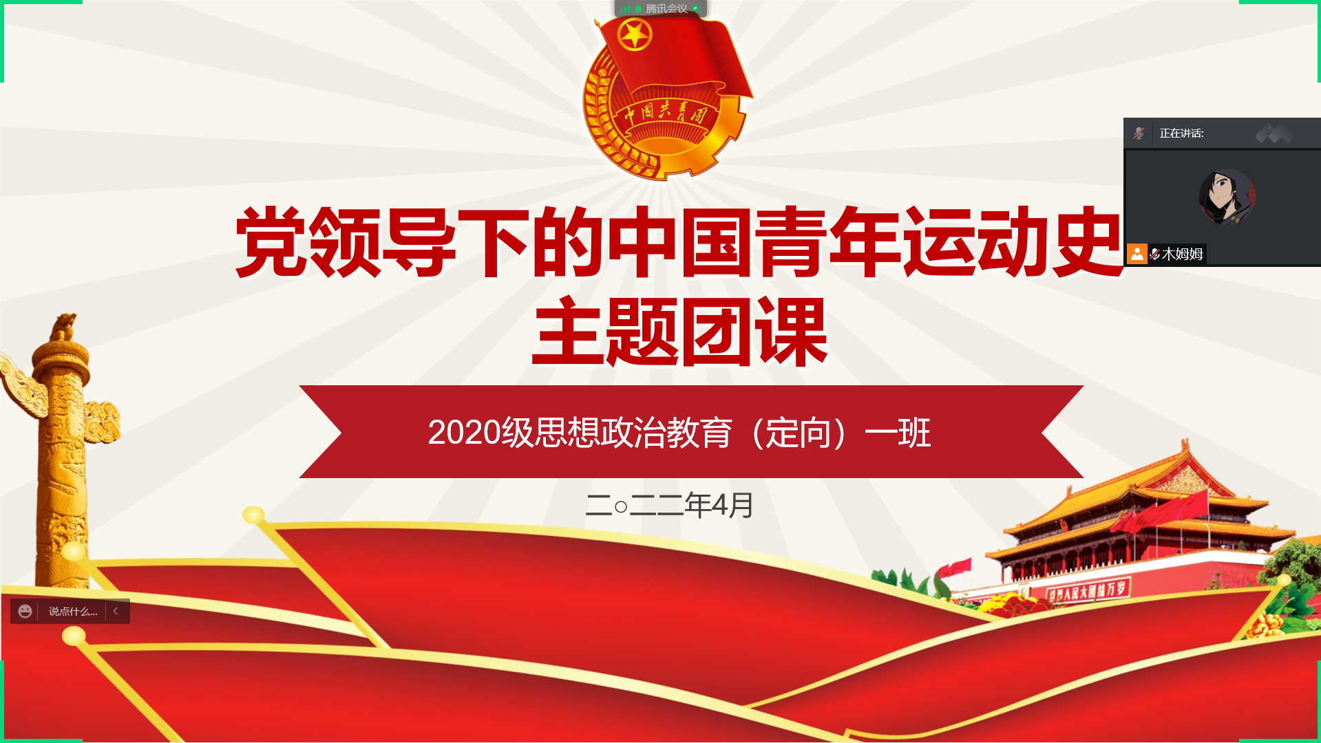 4月26日上午,sjb世俱杯网站2020级思想政治教育定向一班通过腾讯会议的形式召开了党领导下的中国青年运动史主题团课。2020级思想政治教育定向一班全体同学共同参加本次会议。
