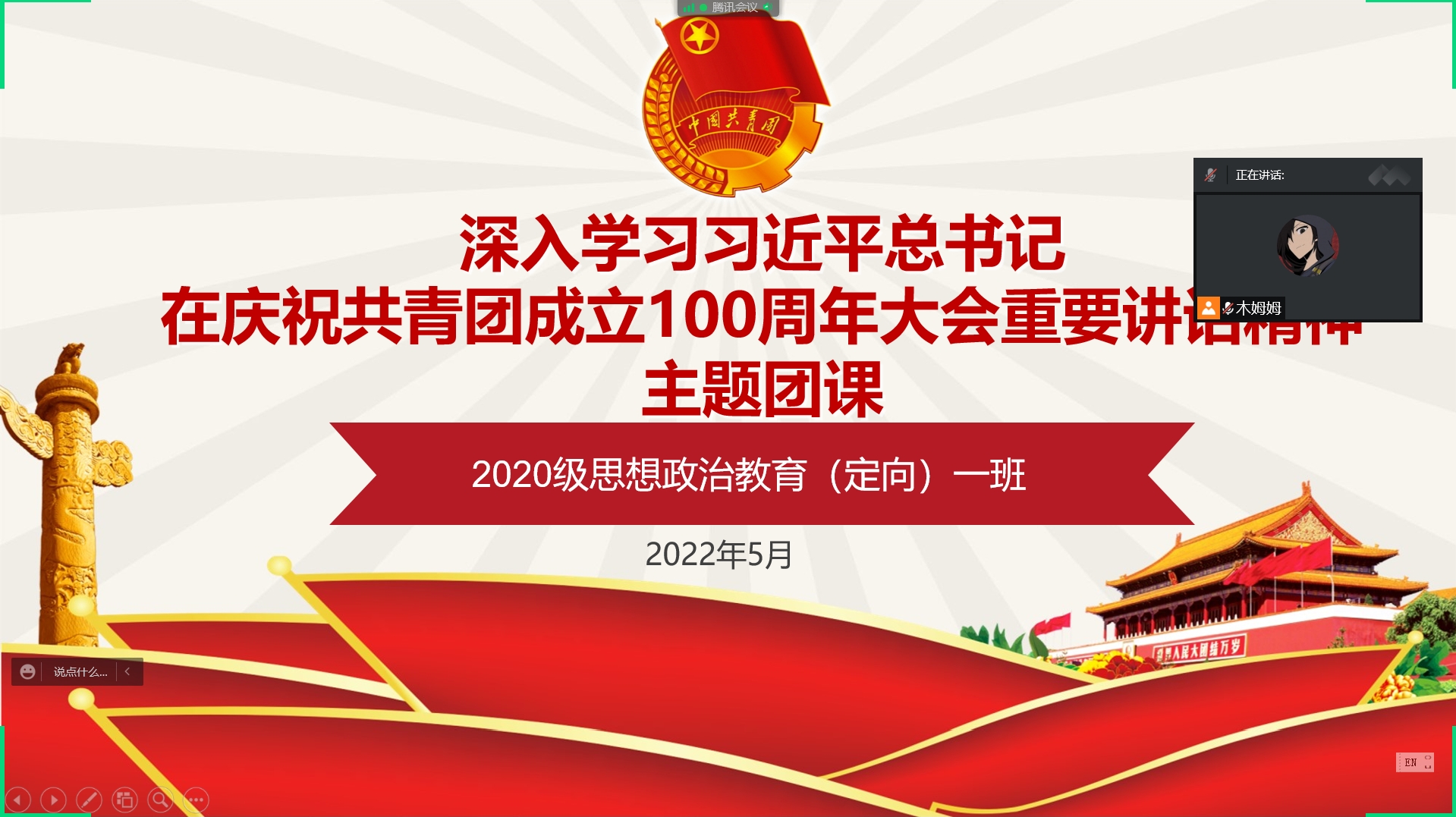5月17日晚,sjb世俱杯网站2020级思想政治教育定向一班通过线上的形式开展了“深入学习习近平总书记在庆祝共青团成立100周年大会重要讲话精神”主题团课。