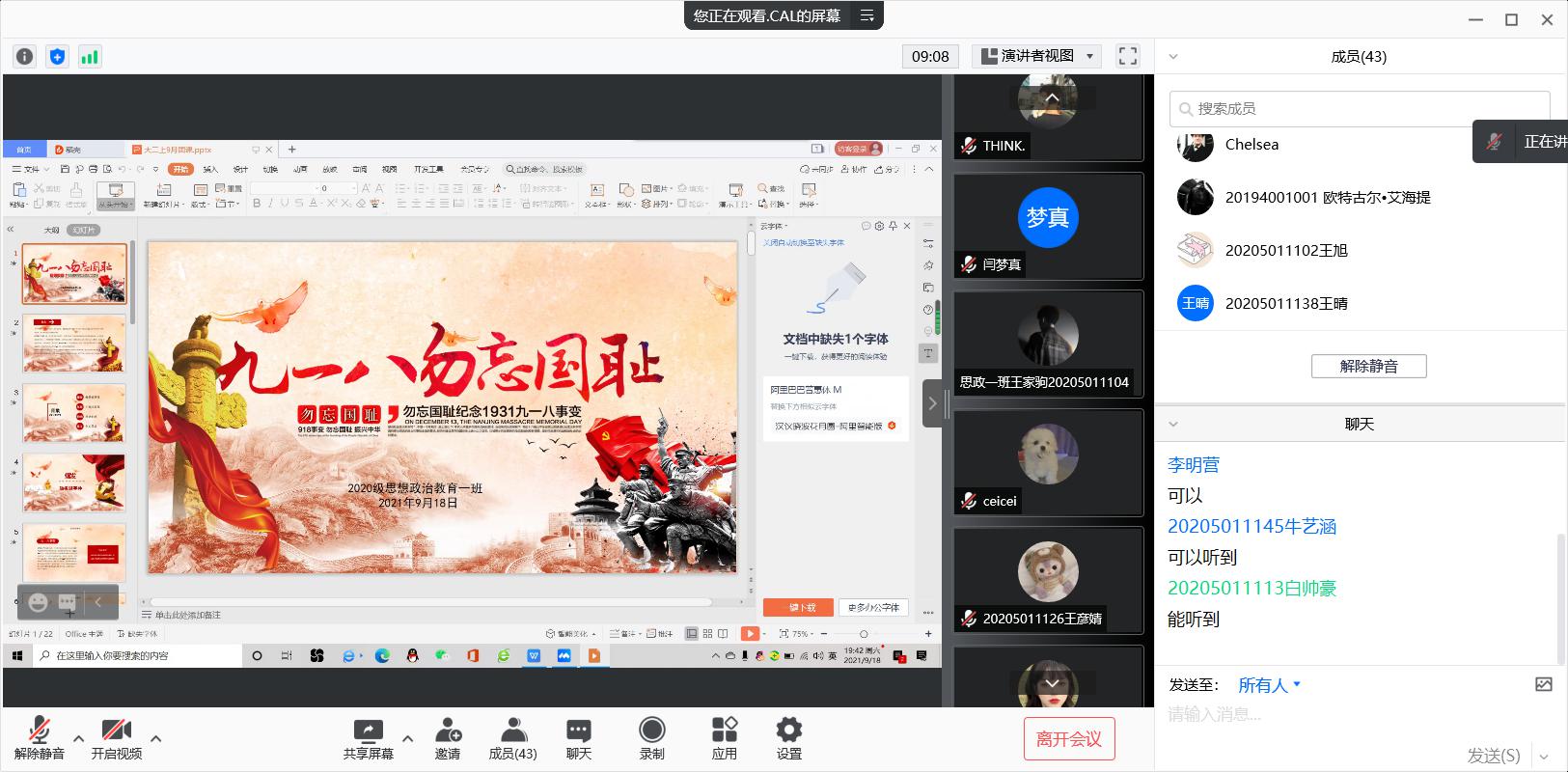 9月18日,sjb世俱杯网站2020级思想政治教育一班在腾讯会议上召开“九一八勿忘国耻”团课。2020级思想政治教育一班全体同学参加此次团课,团课由团支书卢茜雨主持。