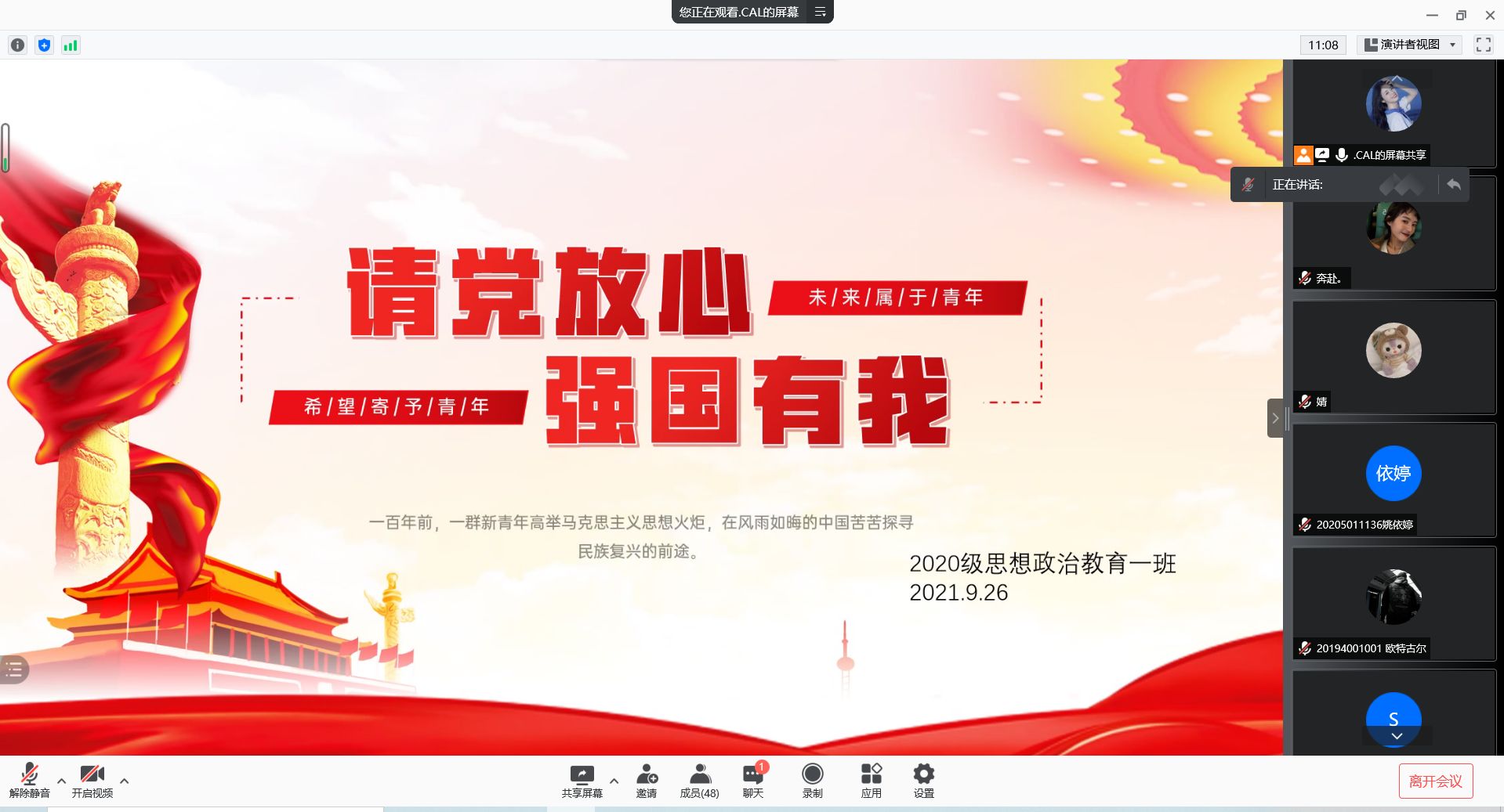 9月26日晚上,sjb世俱杯网站2020级思想政治教育一班在腾讯会议上召开主题为“请党放心,强国有我”的团支部大会。2020级思想政治教育一班全体同学全程参加本次团支部大会,大会由团支书卢茜雨主持。