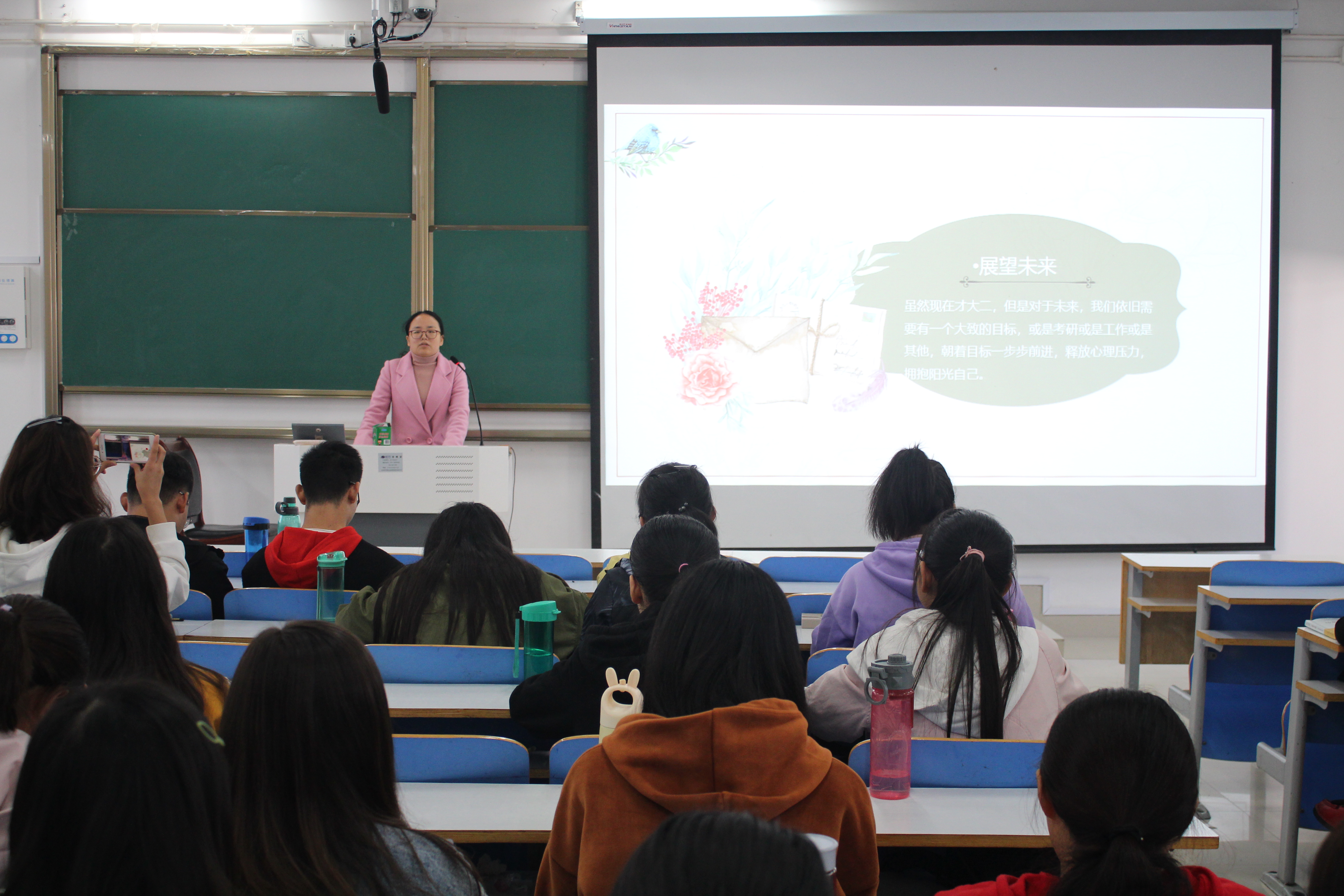 首先,葛梦想指出,此次班会开展的目的是帮助同学们释放心理压力,使大家更好地投身于学习工作中。随后,她强调心理健康和身体健康同等重要,心理健康问题不容忽视,并通过PPT展示向同学们介绍了心理健康的基本知识,希望同学们树立积极乐观的生活态度,成为一名优秀的社会主义建设者和接班人。接着,温玉婉上台发言,她认为拥有健康心理是大学生成长成才的基础与关键,我们应合理安排学习计划,积极参加课余活动,不断提升个人的综合素质。最后,曹菁菁进行总结发言,她提出,要提高对身边同学心理健康问题的关注度,发现问题要及时与老师交流沟通,寻找解决办法。她鼓励同学们积极参加心理健康知识竞赛、心理情景剧等活动,调节自身情绪,树立健康心理。