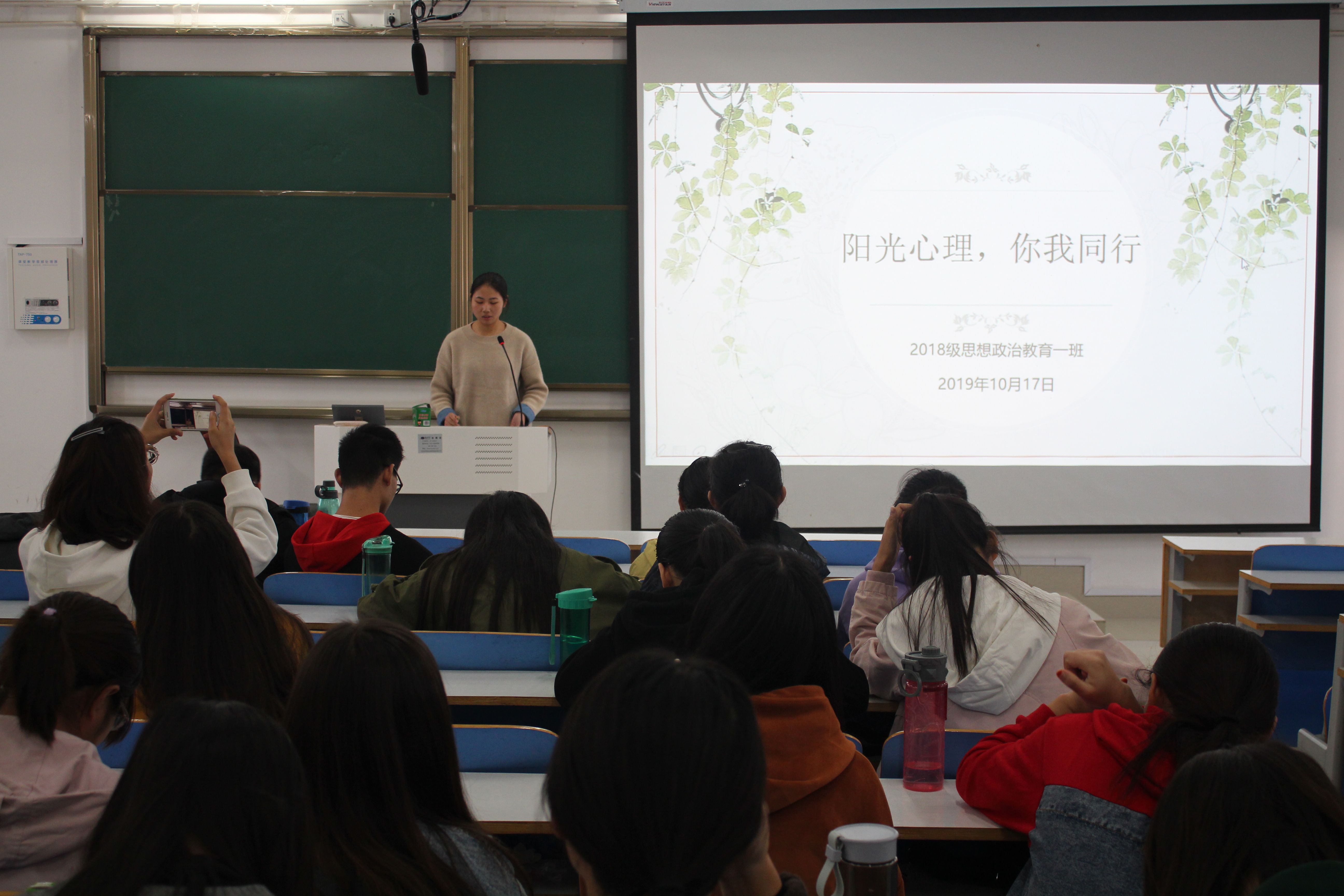 为提升同学们的心理调节能力,培养良好的心理品质,10月17日上午,sjb世俱杯网站2018级思想政治教育一班在社科楼515教室顺利开展“阳光心理,你我同行”心理健康班会。团委老师曹菁菁和2018级全体同学共同参加了此次会议。会议由生活委员葛梦想主持。