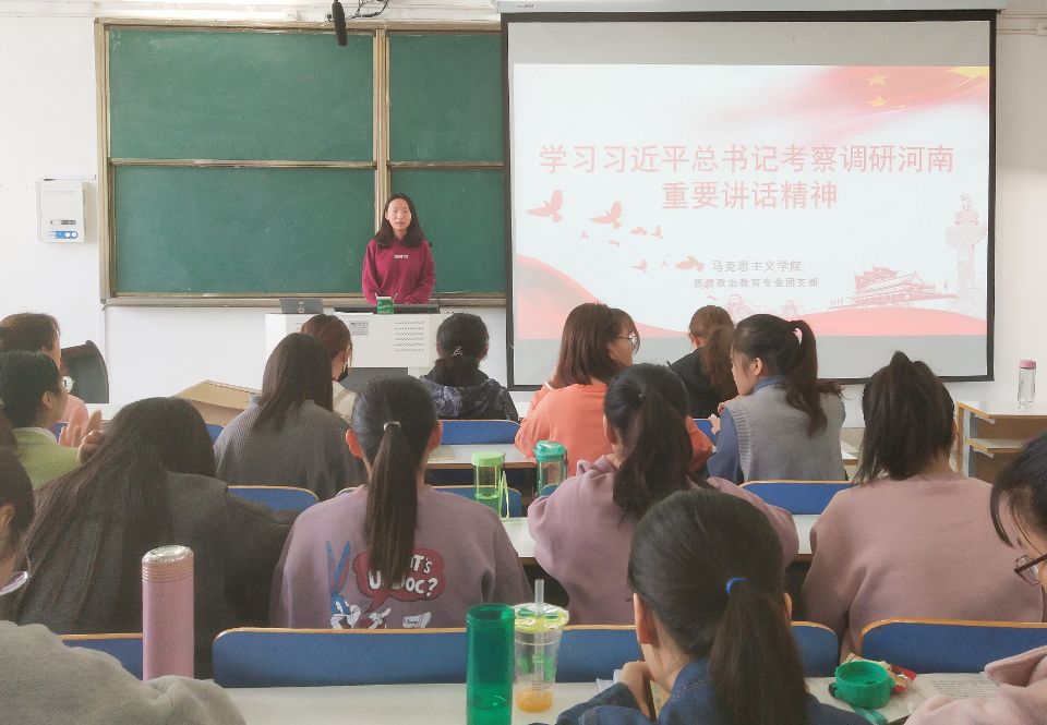 首先,靳雨露带领同学们共同学习习近平总书记考察调研河南的重要讲话精神。她指出,我们应在“不忘初心,牢记使命”的主题教育中认真学习贯彻习近平总书记考察调研河南的重要讲话精神,不断传承红色基因、增强四个意识、坚定四个自信,成为一名优秀的社会主义建设者和接班人。接着,学生代表卞晓莹上台发言,她提出,不忘初心是实现人生价值的前提条件,是促进自我成长发展的关键。作为思政学子的我们肩负着理想与担当,应当紧跟时代潮流,学习党的先进思想,努力发展自我、完善自我,充分发扬sjb世俱杯网站“一马当先”的优秀精神。最后,靳雨露进行总结发言,希望全体同学坚定理想与目标,不忘初心,戒骄戒躁,充分实现自我价值。