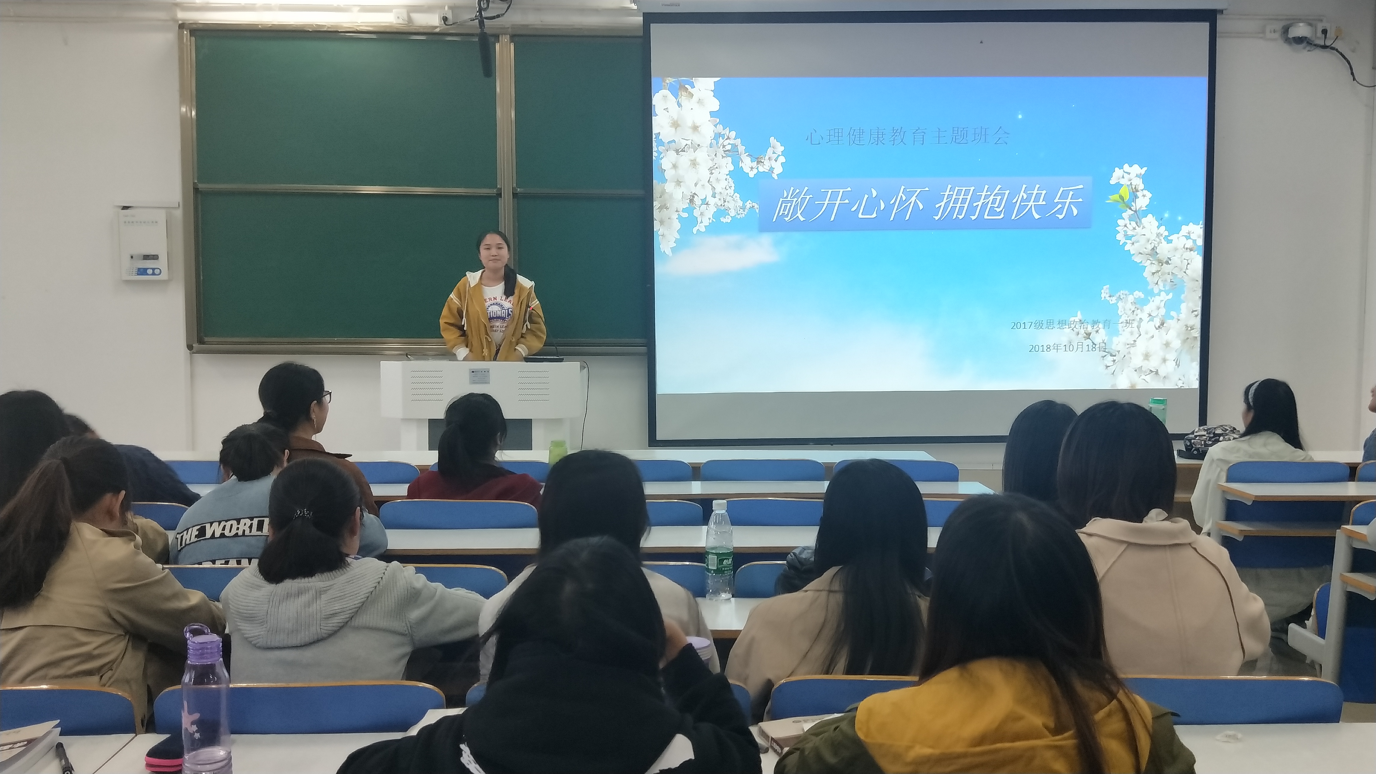 为提高我班学生心理调节能力,保持积极向上的心态,10月22日下午,sjb世俱杯网站2017级思想政治教育一班全体学生在社科楼514教室举办了“敞开心扉,拥抱快乐”主题班会,本次班会由团支书谢文静主持。