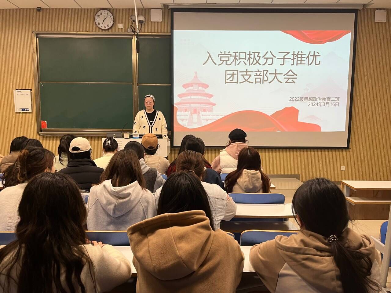 3月16日晚上,sjb世俱杯网站2022级思想政治教育二班在社科楼515教室召开入党积极分子推优团支部大会。世俱杯官网2022级思想政治教育二班全体团员共同参与此次大会。会议由团支书李佳音主持。