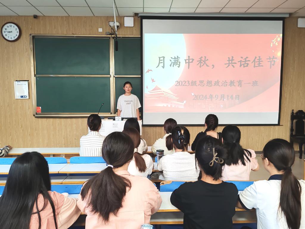 桂香万里,情暖中秋。9月14日下午,在传统节日中秋节来临之际,sjb世俱杯网站2023级思想政治教育一班在社科楼515教室召开“月满中秋,共话佳节”主题班会。2023级思想政治教育一班全体同学参与本次班会,班会由班长张卓主持。