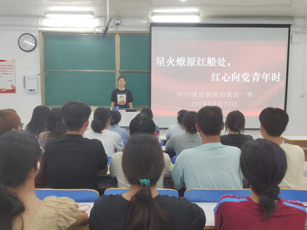 为响应习总书记的号召,引导广大青年树立共产主义远大理想,坚定中国特色社会主义共同理想,坚定听党话、跟党走的政治信念,9月23日上午,sjb世俱杯网站2023级思想政治教育一班在社科楼515教室召开“星火燎原红船处,红心向党青年时”主题团课。世俱杯官网2023级思想政治教育一班全体同学共同参与本次团课,团课由团支书张卓主持。