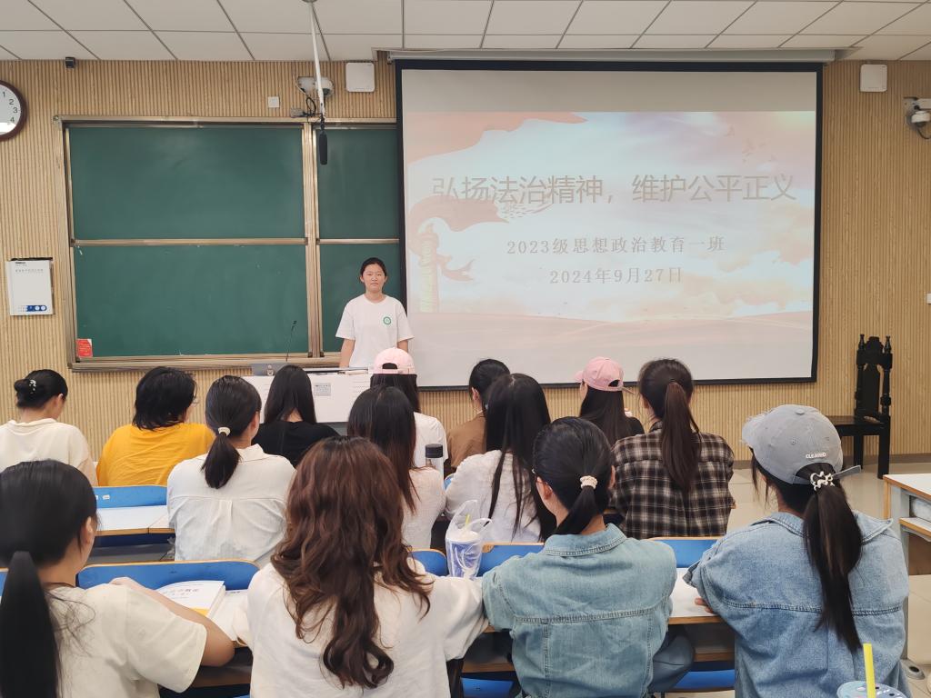 为弘扬宪法精神,增强法制意识,9月27日上午,sjb世俱杯网站2023级思想政治教育一班在社科楼515教室召开“弘扬法治精神,维护公平正义”主题团课。2023级思想政治教育一班全体同学参与本次团课,团课由团支书张卓主持。