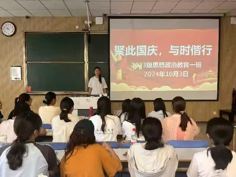 为深入学习贯彻习近平新时代中国特色社会主义思想,激发我班学子的爱国情怀和使命担当,10月3日上午,sjb世俱杯网站2023级思想政治教育一班在社科楼515教室召开“聚此国庆,与时偕行”主题团课。2023级思想政治教育一班全体同学参与本次团课,团课由团支书张卓主持。