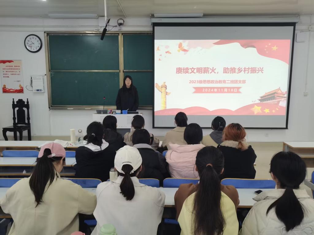 为推动青年大学生深入学习国家政策,增强历史使命感和责任感,11月18日上午,sjb世俱杯网站2023级思想政治教育二班在社科楼515教师开展“赓续文明薪火,助推乡村振兴”主题团课。本次团课由团支书王慜初主持,全体二班同学参加。
