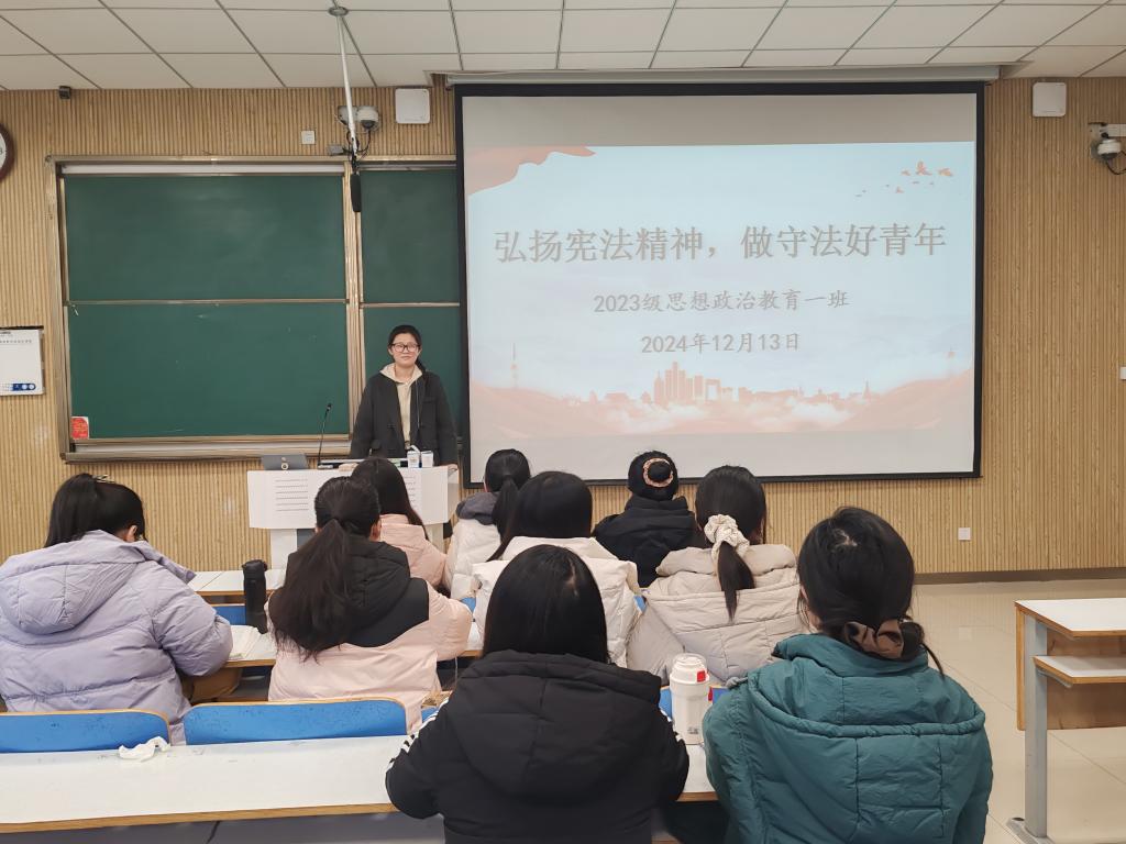 为增强我班学子的宪法意识,推动法治观念深入人心。2024 年12月13日,sjb世俱杯网站 2023 级思想政治教育一班召开“弘扬宪法精神,做守法好青年”主题班会。2023级思想政治教育一班全体同学参与本次团课,团课由团支书张卓主持。