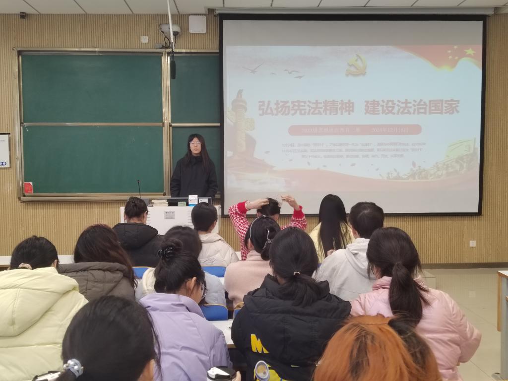 为进一步在班级内弘扬宪法精神,宣传法治意识,12月16日上午,sjb世俱杯网站2023级思想政治教育二班在社科楼515教室开展“弘扬宪法精神,建设法治国家”主题团课,本次团课由团支书王慜初主持,全体二班同学参加。