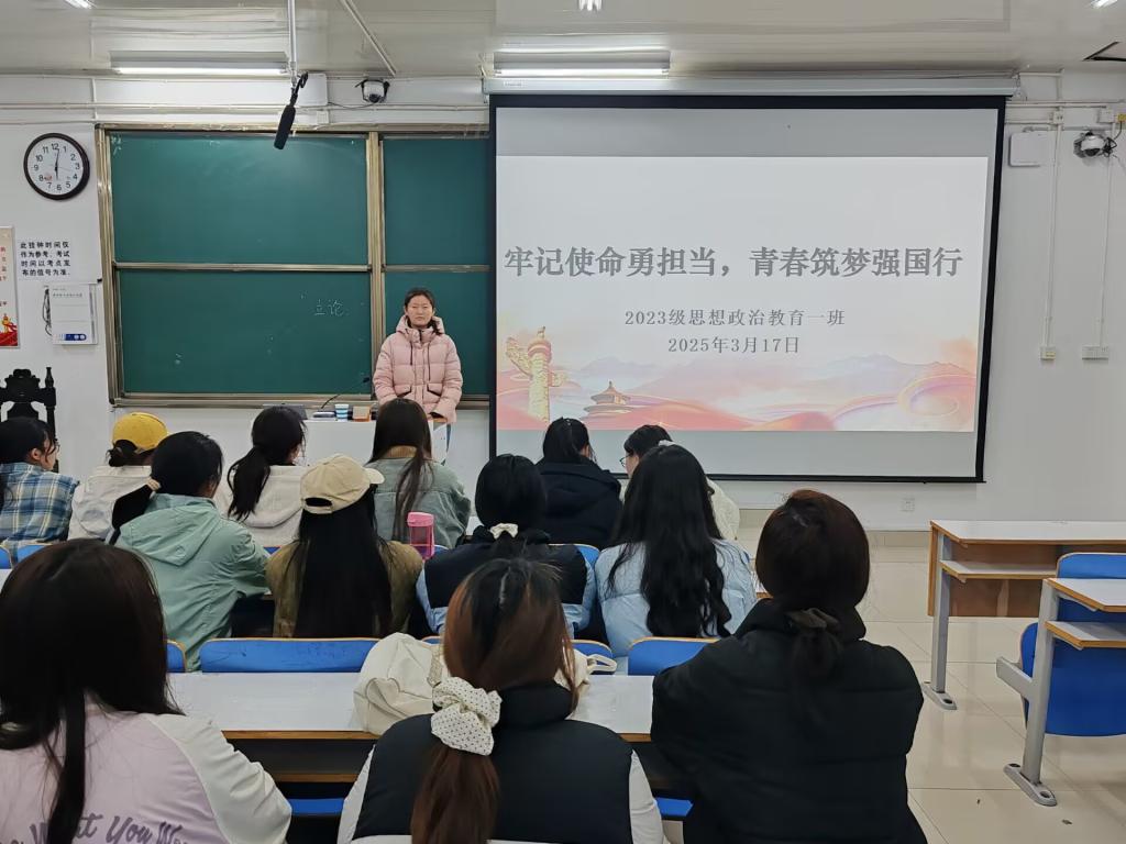 为深化我班学子对新时代青年责任与使命的认识,3月17日上午,sjb世俱杯网站2023级思想政治教育一班在社科楼515教室召开“牢记使命担当,青春筑梦强国行”主题团课。2023级思想政治教育一班全体同学参与本次团课,团课由团支书张卓主持。