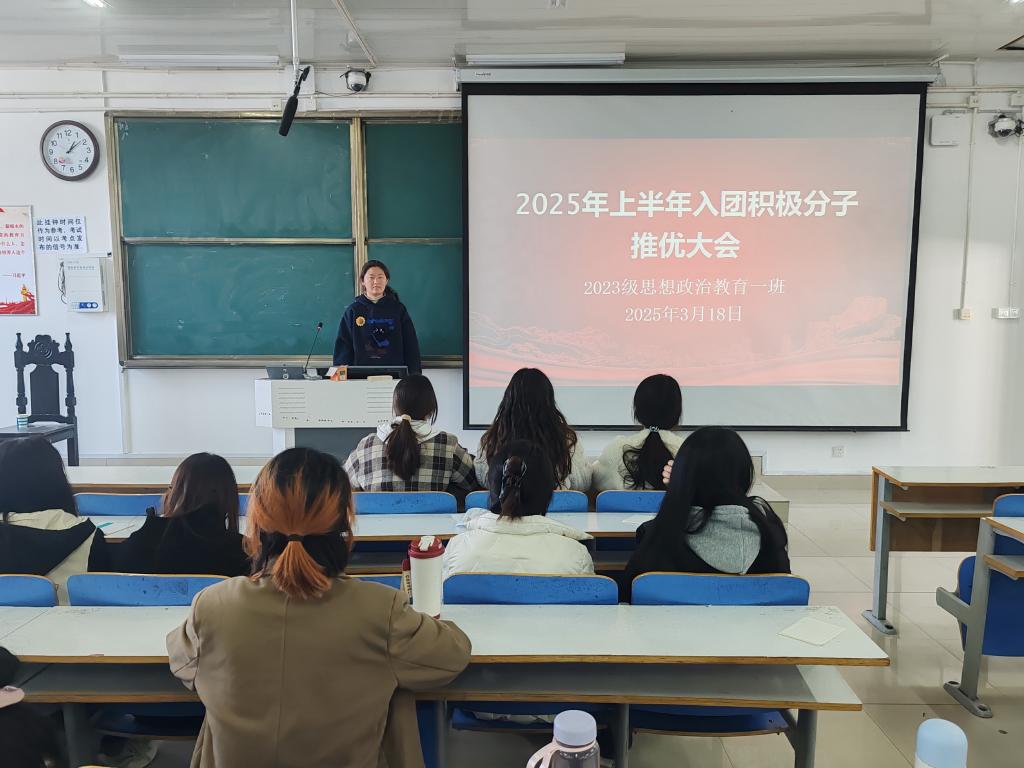 为进一步加强团组织建设,增强团支部的凝聚力,积极开展团青工作,3月18日下午,sjb世俱杯网站2023级思想政治教育一班在社科楼515教室召开入团积极分子推优大会。世俱杯官网2023级思想政治教育一班全体团员共同参与本次班会,班会由团支书张卓主持。