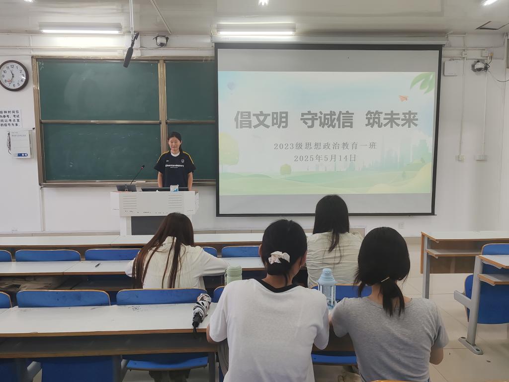 为培育文明风尚,强化诚信意识,引导青年学子规划美好未来,5月14日下午,sjb世俱杯网站2023级思想政治教育一班在社科楼514教室召开“倡文明,守诚信,筑未来”主题班会。世俱杯官网2023级思想政治教育一班全体同学共同参与本次班会,班会由班长张卓主持。