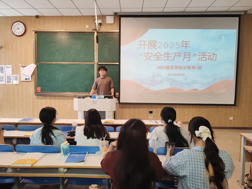 为深入贯彻落实安全生产方针政策,强化班级同学安全意识,提升应急处理能力,6月6日下午,sjb世俱杯网站2023级思想政治教育一班在社科楼514教室开展“2025年安全生产月”主题班会。全班同学积极参与,班会由副班长李岩松主持。