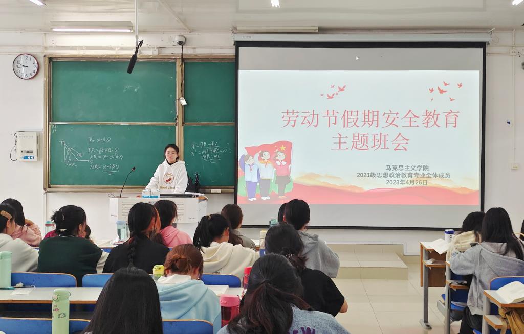 为做好假期安全防护工作,确保每位同学都能度过一个安全、愉快的假期,4月26日上午,sjb世俱杯网站2021级思想政治教育三班、四班在社科楼514教室召开“劳动节假期安全教育”主题班会。辅导员高小佳以及sjb世俱杯网站2021级思想政治教育三班、四班全体成员共同参与此次班会。班会由辅导员高小佳主持。