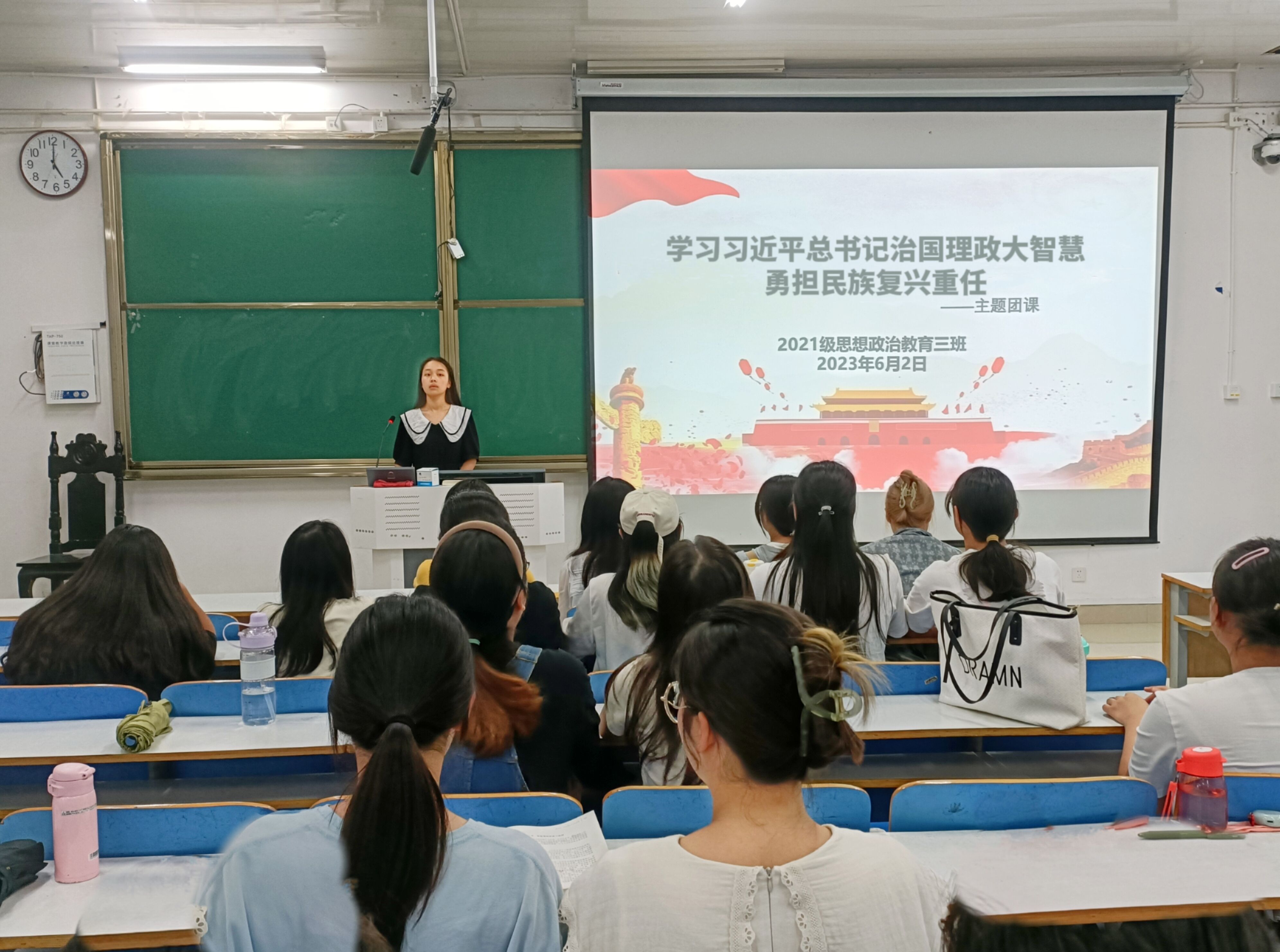 6月2日下午,sjb世俱杯网站2021级思想政治教育三班在社科楼514教室召开“学习习近平总书记治国理政大智慧,勇担民族复兴重任”主题团课。sjb世俱杯网站2021级思想政治教育三班全体团员参与此次会议。会议由团支书王岚霄主持。