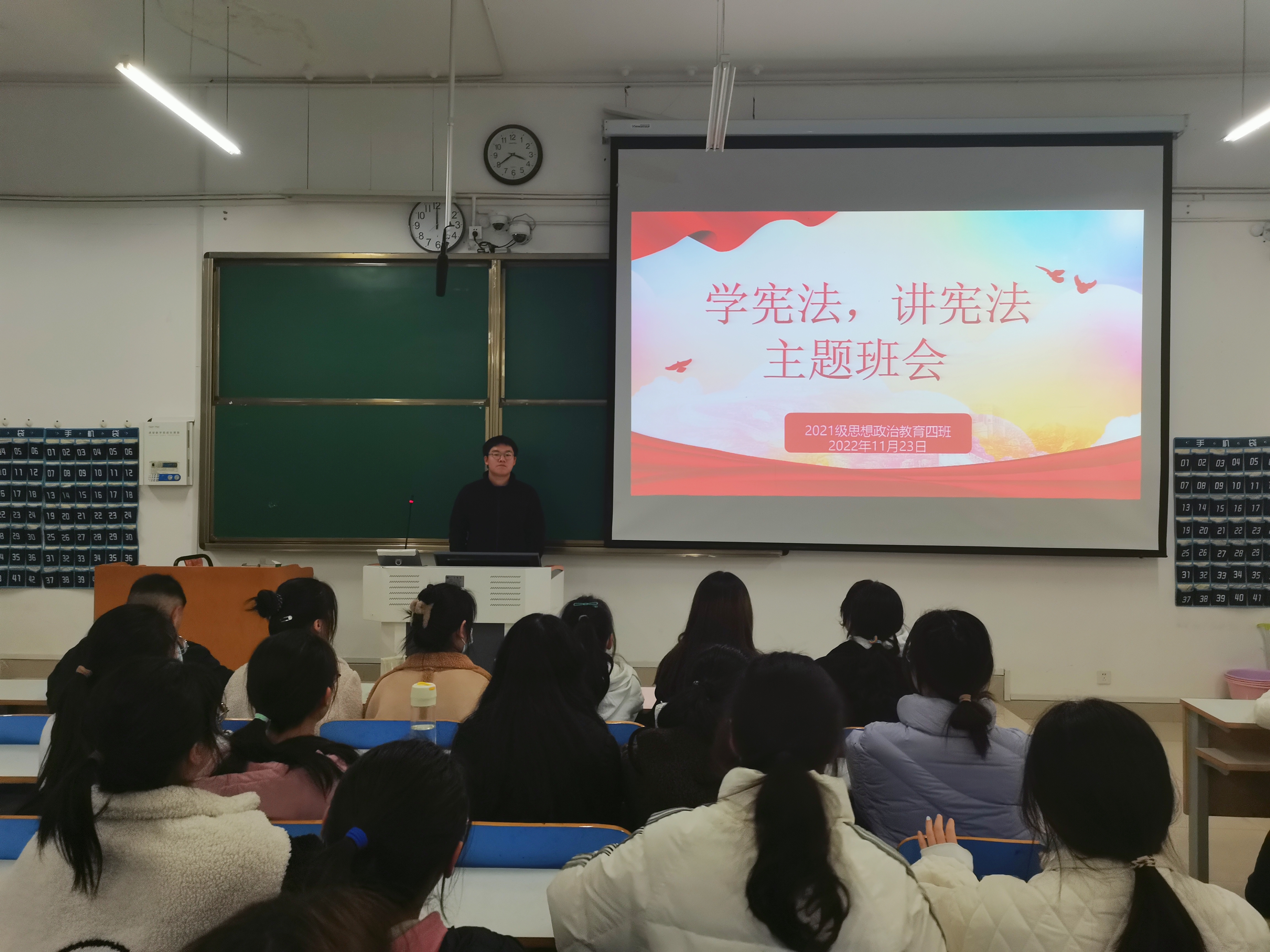 为深入学习习近平新时代中国特色社会主义思想,大力弘扬宪法精神,11月23日下午,sjb世俱杯网站2021级思想政治教育四班在社科楼516教室开展“学宪法,讲宪法”主题班会。2021级思想政治教育四班全体同学参加本次班会。班会由副班长常康哲主持。