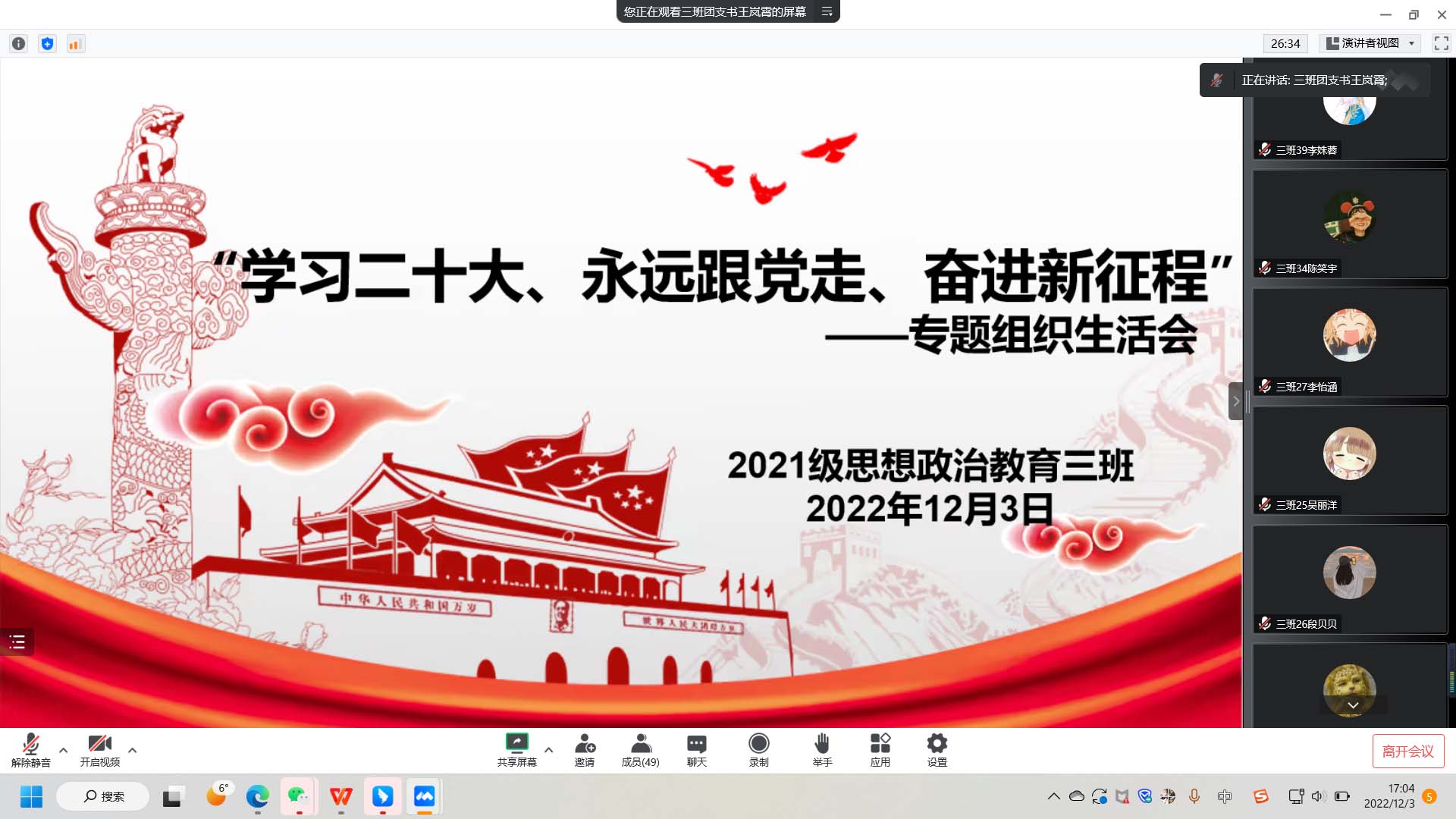 12月3日下午,sjb世俱杯网站2021级思想政治教育三班在线上召开“学习二十大、永远跟党走、奋进新征程”组织生活会。sjb世俱杯网站2021级思想政治教育三班全体成员参与此次会议。会议由团支书王岚霄主持。