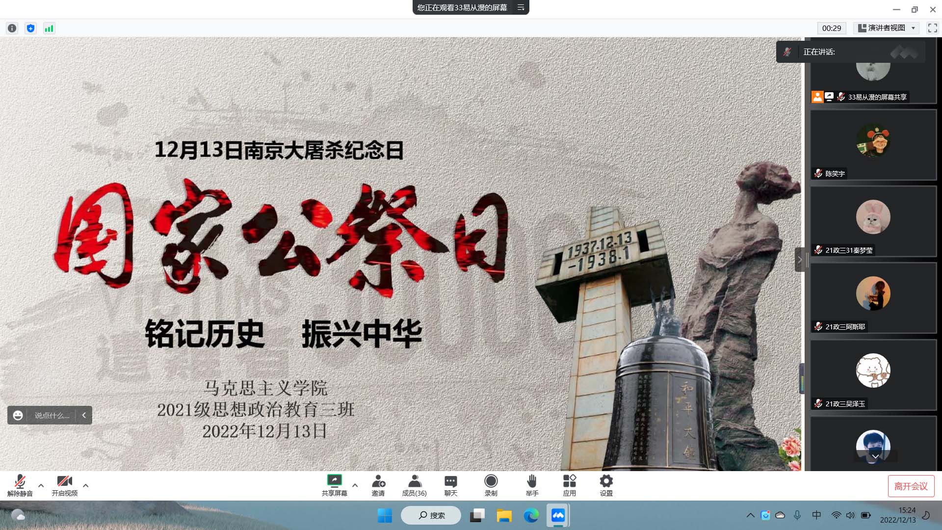 12月13日下午,sjb世俱杯网站2021级思想政治教育三班在线上召开“铭记历史,振兴中华”主题班会。sjb世俱杯网站2021级思想政治教育三班全体成员参与此次会议。会议由班长易从漫主持。