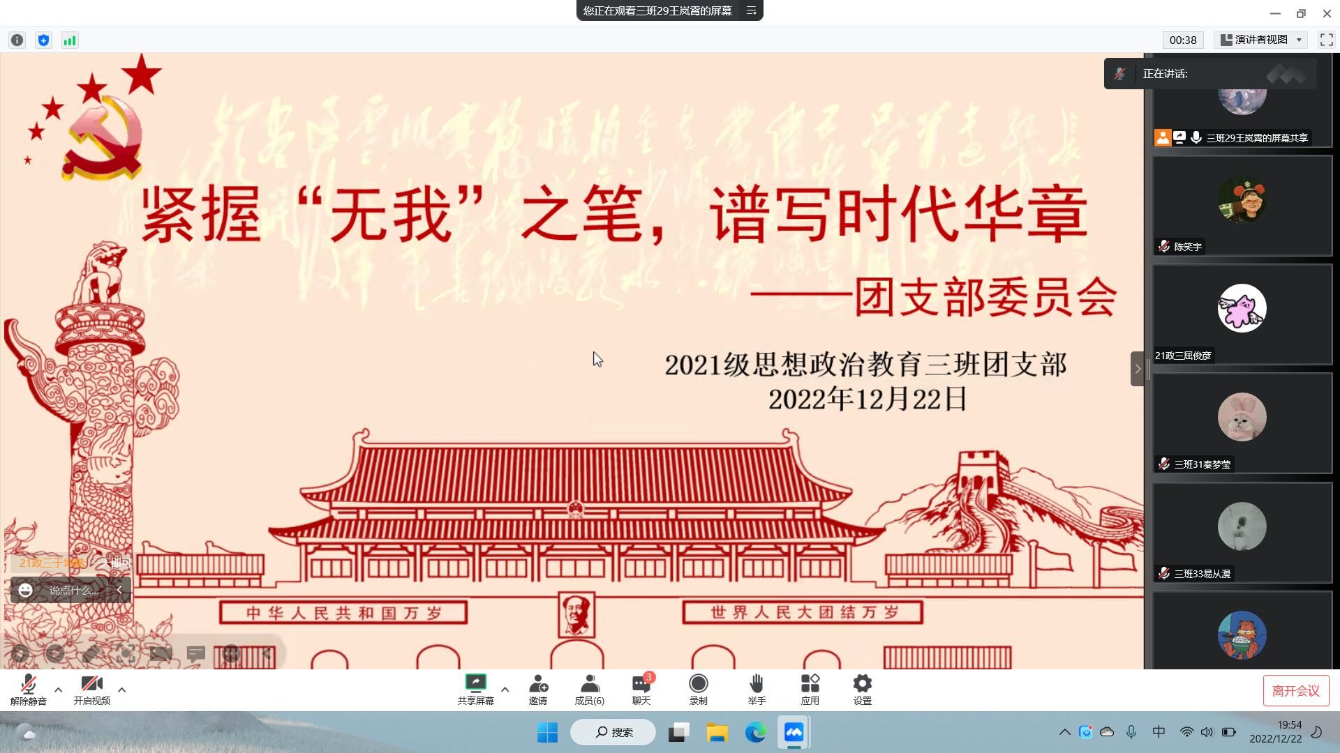 12月22日下午,sjb世俱杯网站2021级思想政治教育三班在线上召开“紧握‘无我’之笔,谱写时代华章”团支部委员会。sjb世俱杯网站2021级思想政治教育三班团支部委员会全体成员参与此次会议。会议由团支书王岚霄主持。