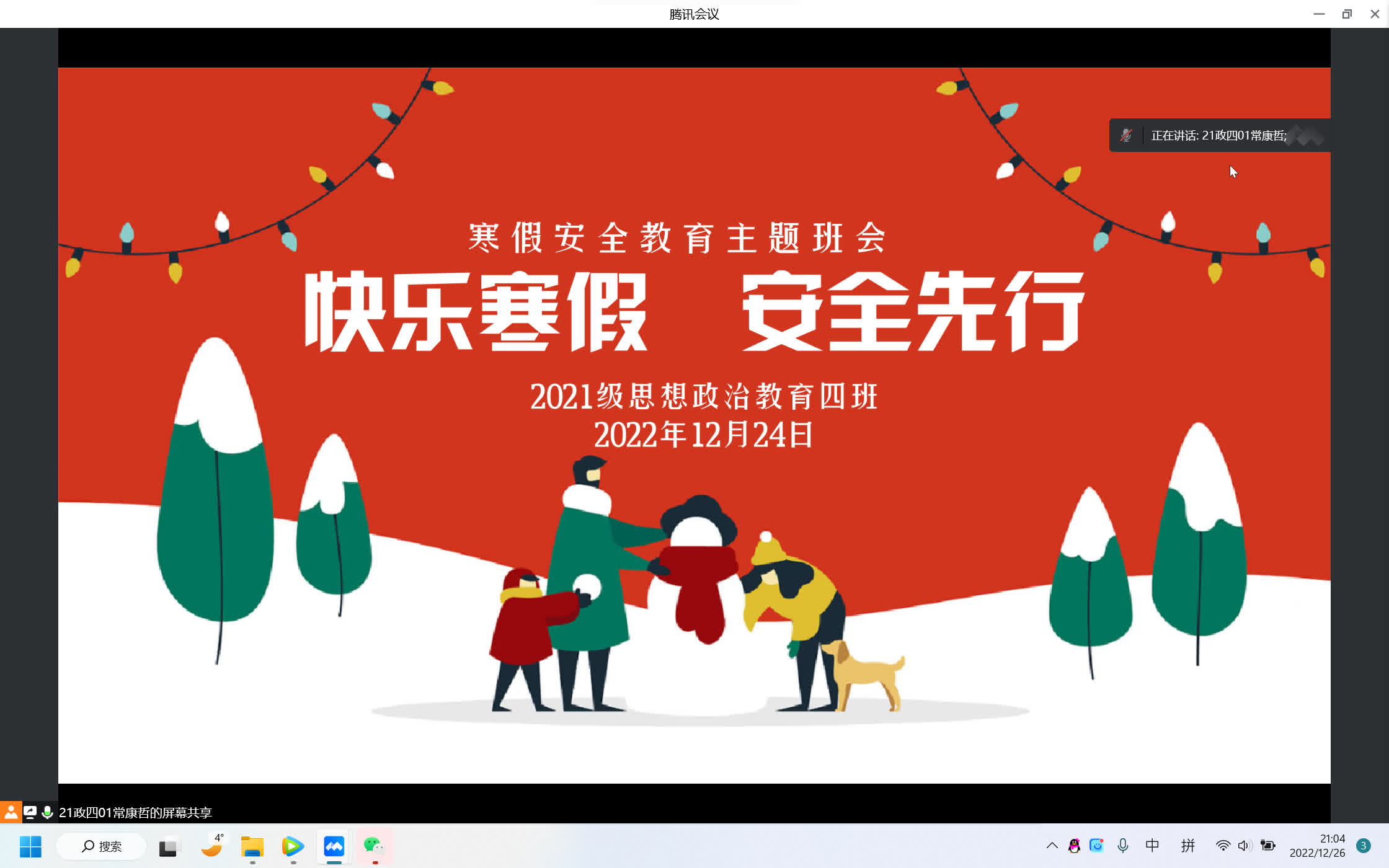 12月24日下午,sjb世俱杯网站2021级思想政治教育四班线上开展“快乐寒假,安全先行”安全教育主题班会。sjb世俱杯网站2021级思想政治教育四班全体同学参加本次会议。会议由副班长常康哲主持。
