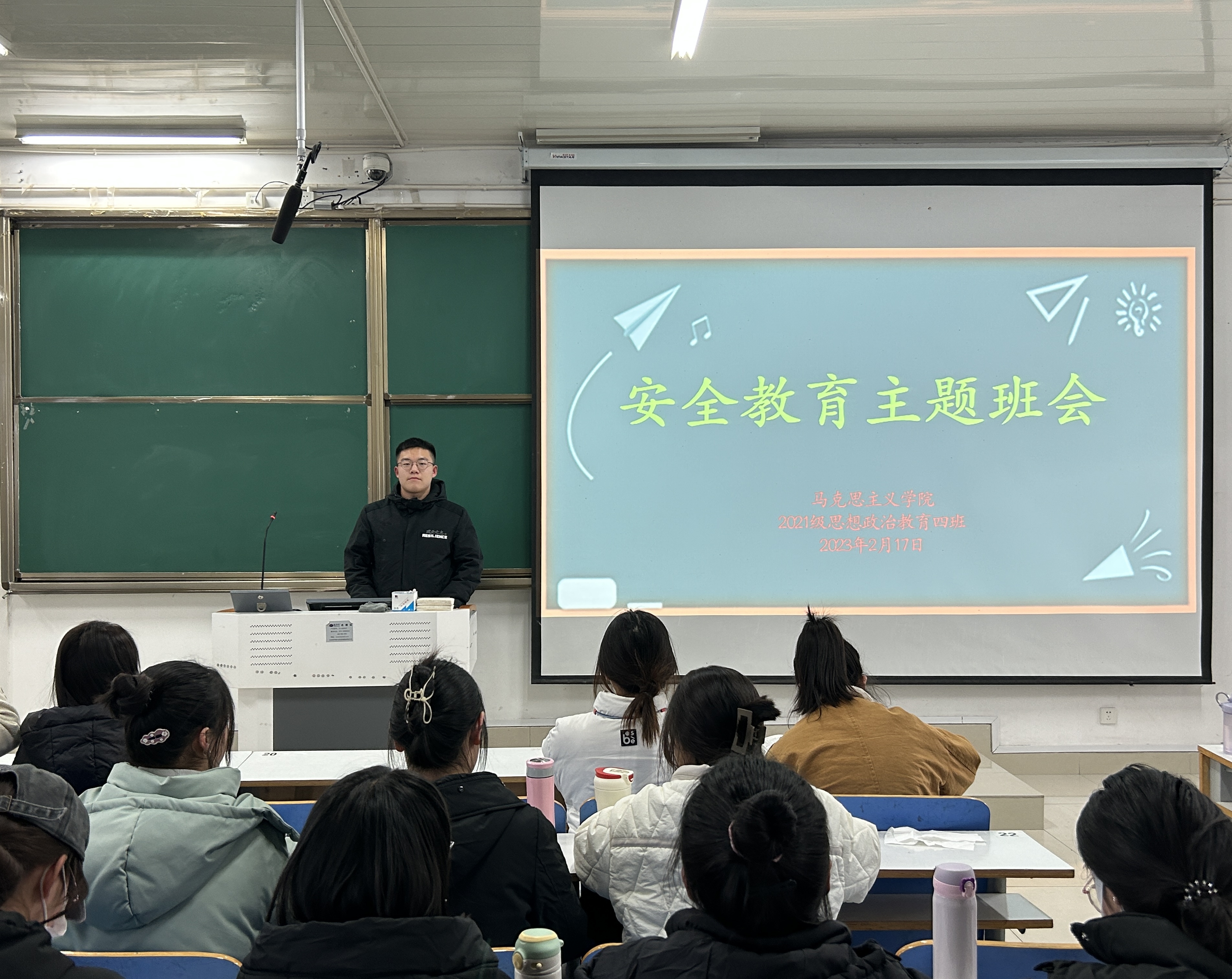 2月17日下午,sjb世俱杯网站2021级思想政治教育四班在社科楼514教室开展安全教育主题班会。2021级思想政治教育四班全体同学共同参会。班会由副班长常康哲主持。
