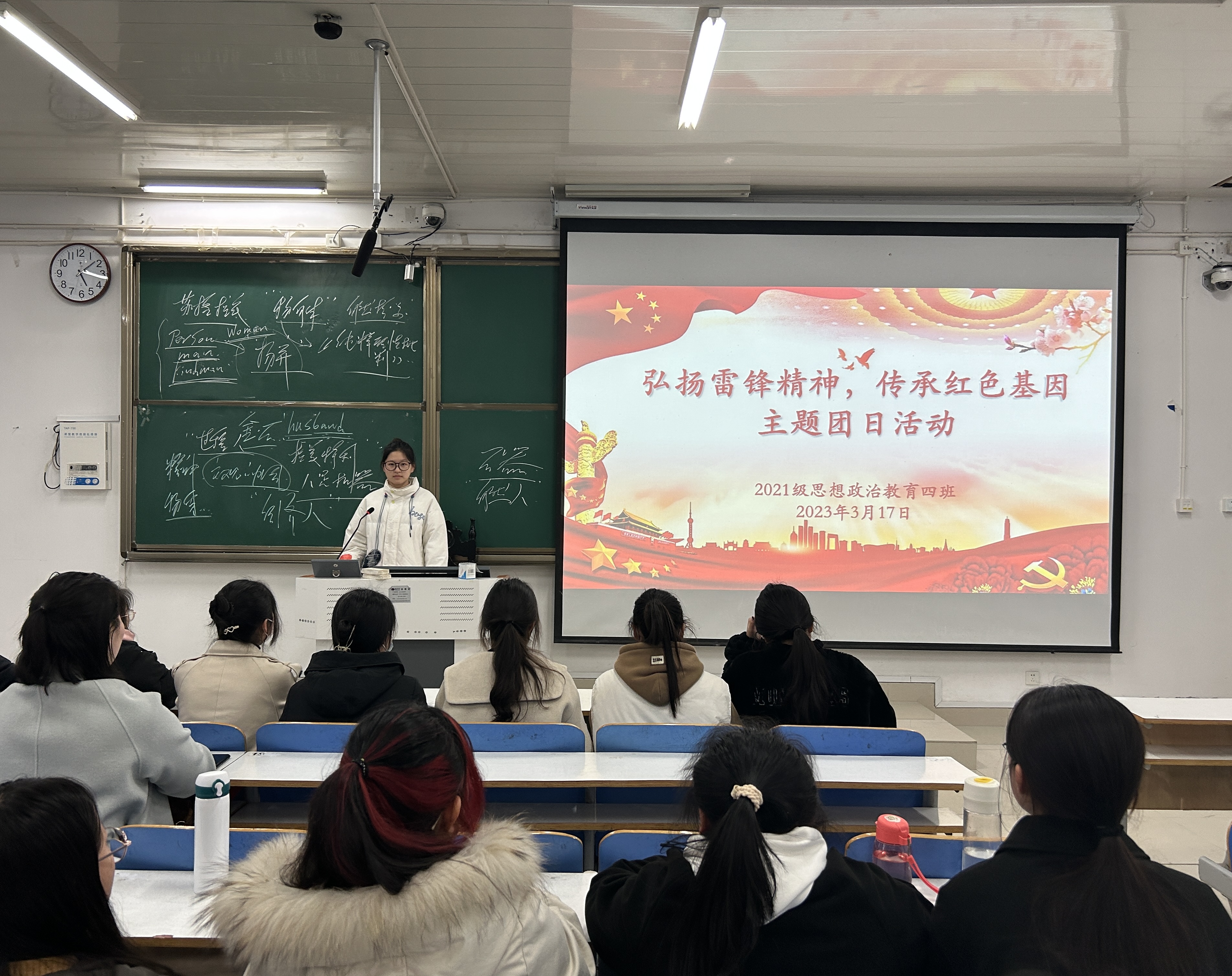 为大力弘扬雷锋精神,传承雷锋艰苦朴素的优良作风,3月17日下午,sjb世俱杯网站2021级思想政治教育四班在社科楼514教室开展“弘扬雷锋精神,传承红色基因”主题团日活动。2021级思想政治教育四班全体成员共同参加本次活动,活动由团支书刘珂含主持。