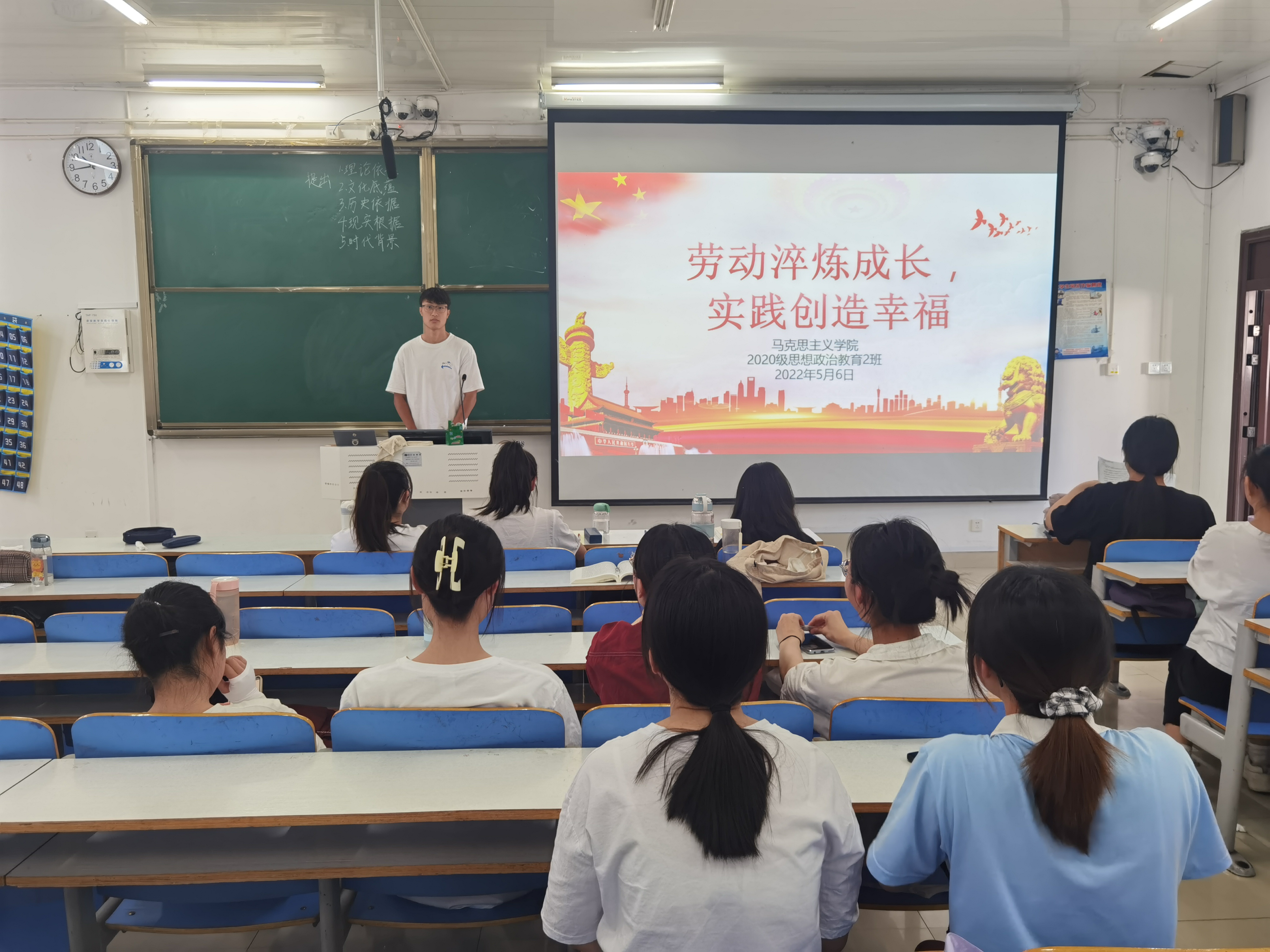 为进一步加强劳动教育,提高同学们的劳动意识,5月6日下午,sjb世俱杯网站2020级思想政治教育二班、定向二班在社科楼514教室开展“劳动淬炼成长,实践创造未来”主题班会。2020级思想政治教育二班、定向二班全体成员参与本次班会。班会由班长陈宇航主持。