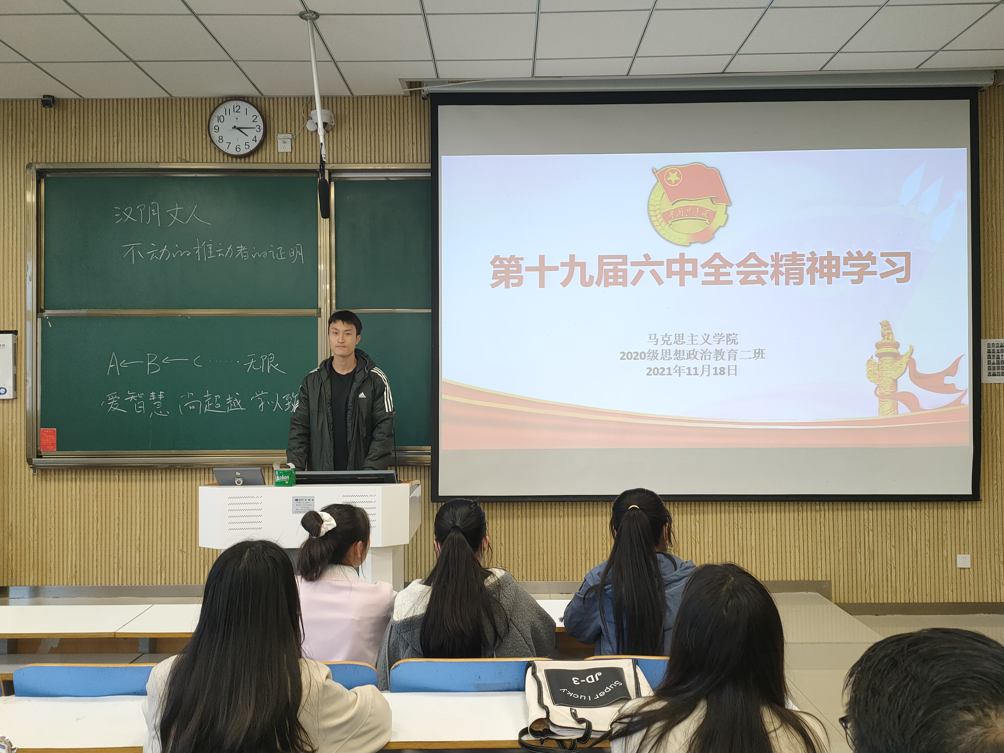 为促使我班团员深入学习党的十九届六中全会精神,回顾党的百年奋斗历程,11月18日下午,sjb世俱杯网站2020级思想政治教育二班、定向二班在社科楼515教室召开学习党的十九届六中全会精神主题团课。2020级思想政治教育二班、定向二班全体团员共同参与本次团课。团课由团支书陈宇航主持。