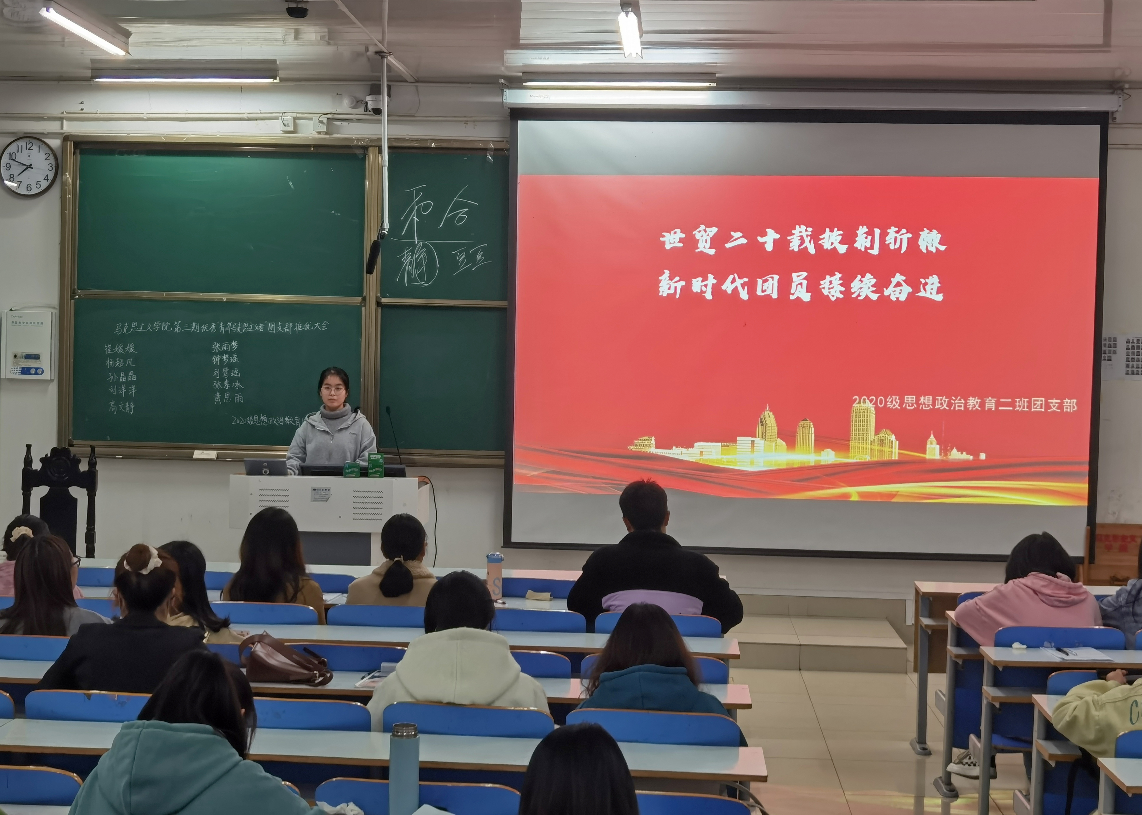 11月19日晚,sjb世俱杯网站2020级思想政治教育二班、定向二班在社科楼516教室召开“世贸二十载披荆斩棘,新时代团员接续奋进”主题团课。2020级思想政治教育二班、定向二班全体团员共同参与本次团课。团课由黄思雨讲授。
