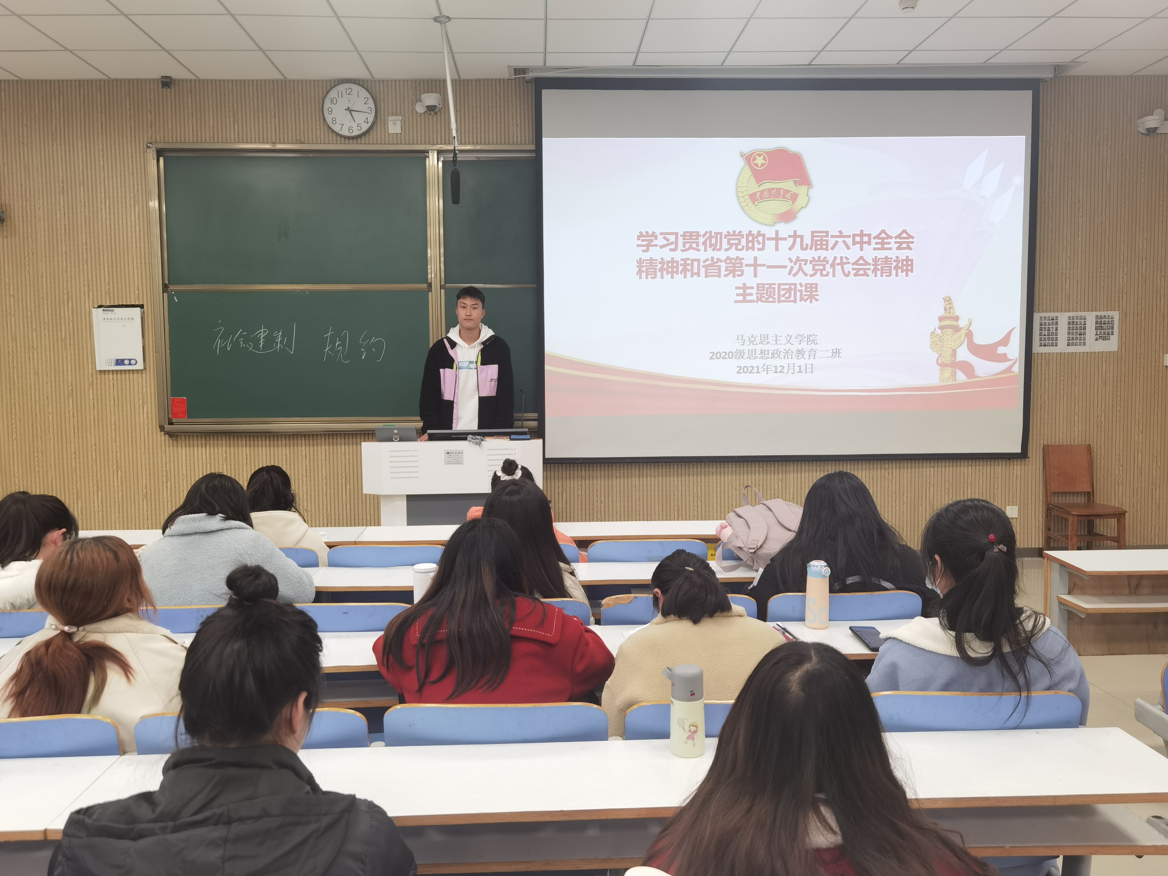 为深入学习贯彻党的十九届六中全会精神及河南省第十一次党代会精神,12月1日下午,sjb世俱杯网站2020级思想政治教育二班、定向二班在社科楼515教室开展学习贯彻党的十九届六中全会及河南省第十一次党代会精神主题团课。2020级思想政治教育二班、定向二班全体团员共同参与本次团课。团课由团支书陈宇航主持。