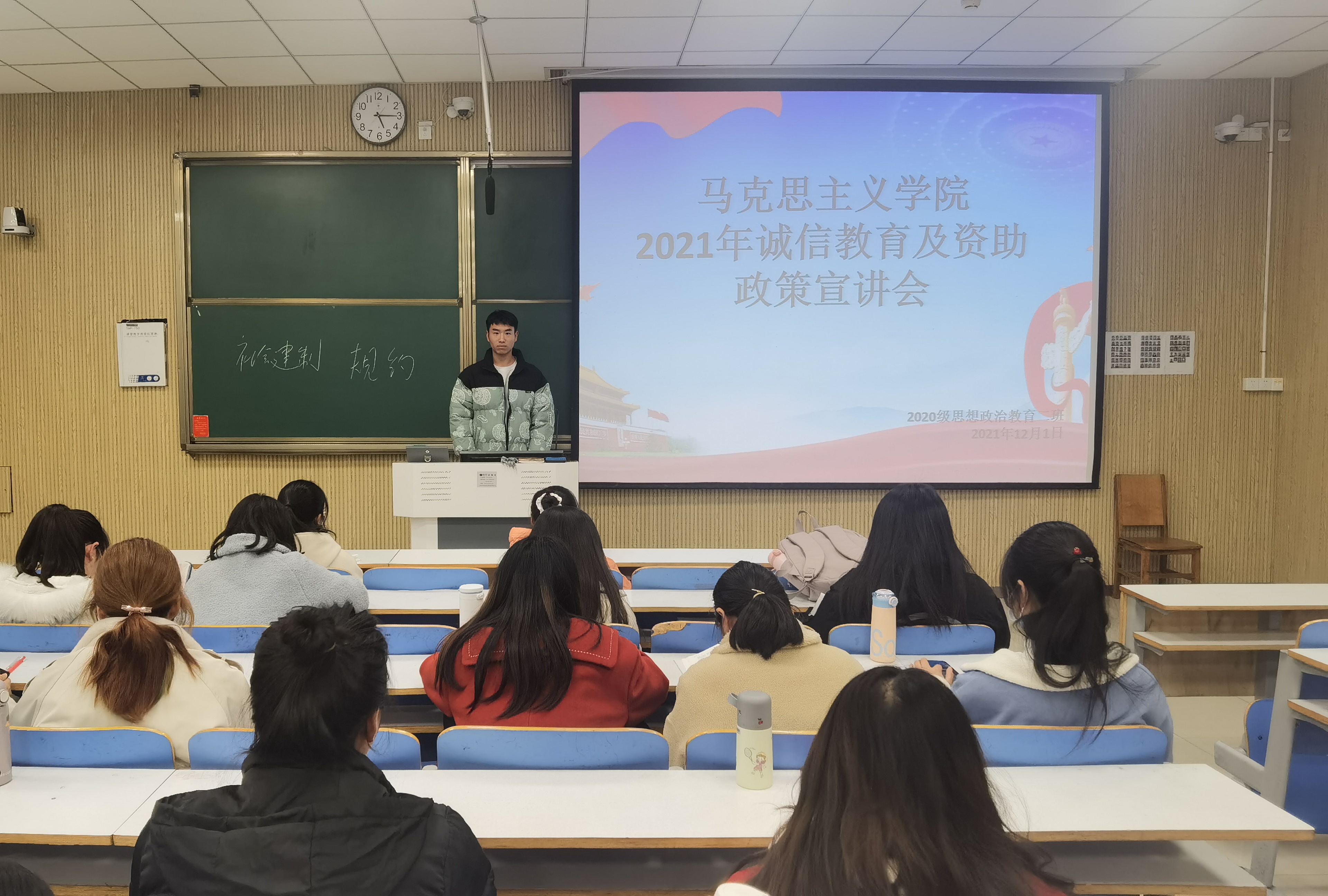 为进一步推进世俱杯官网资助政策和资助育人宣传工作,切实增强资助工作实效。12月1日下午,sjb世俱杯网站2020级思想政治教育二班、定向二班在社科楼515教室召开诚信教育及资助政策宣传主题班会。2020级思想政治教育二班、定向二班全体同学共同参与本次班会。班会由副班长高红凯主持。