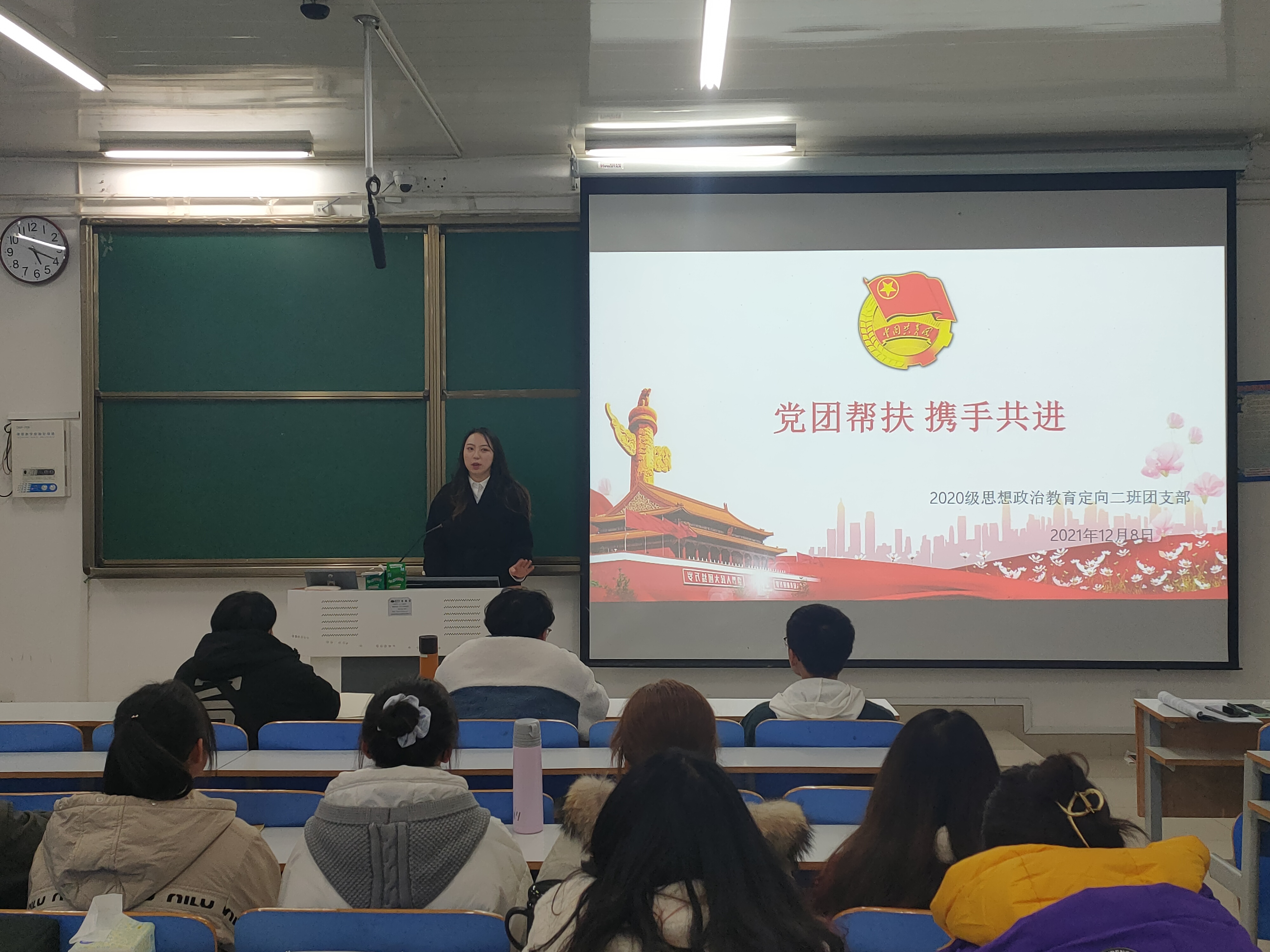 12月8日下午,sjb世俱杯网站2020级思想政治教育定向二班在社科楼514教室召开党团帮扶主题班会。2018级预备党员赵思雨、2019级预备党员宋羽潇和2020级思想政治教育定向二班全体团员共同参与本次班会。班会由副班长高红凯主持。