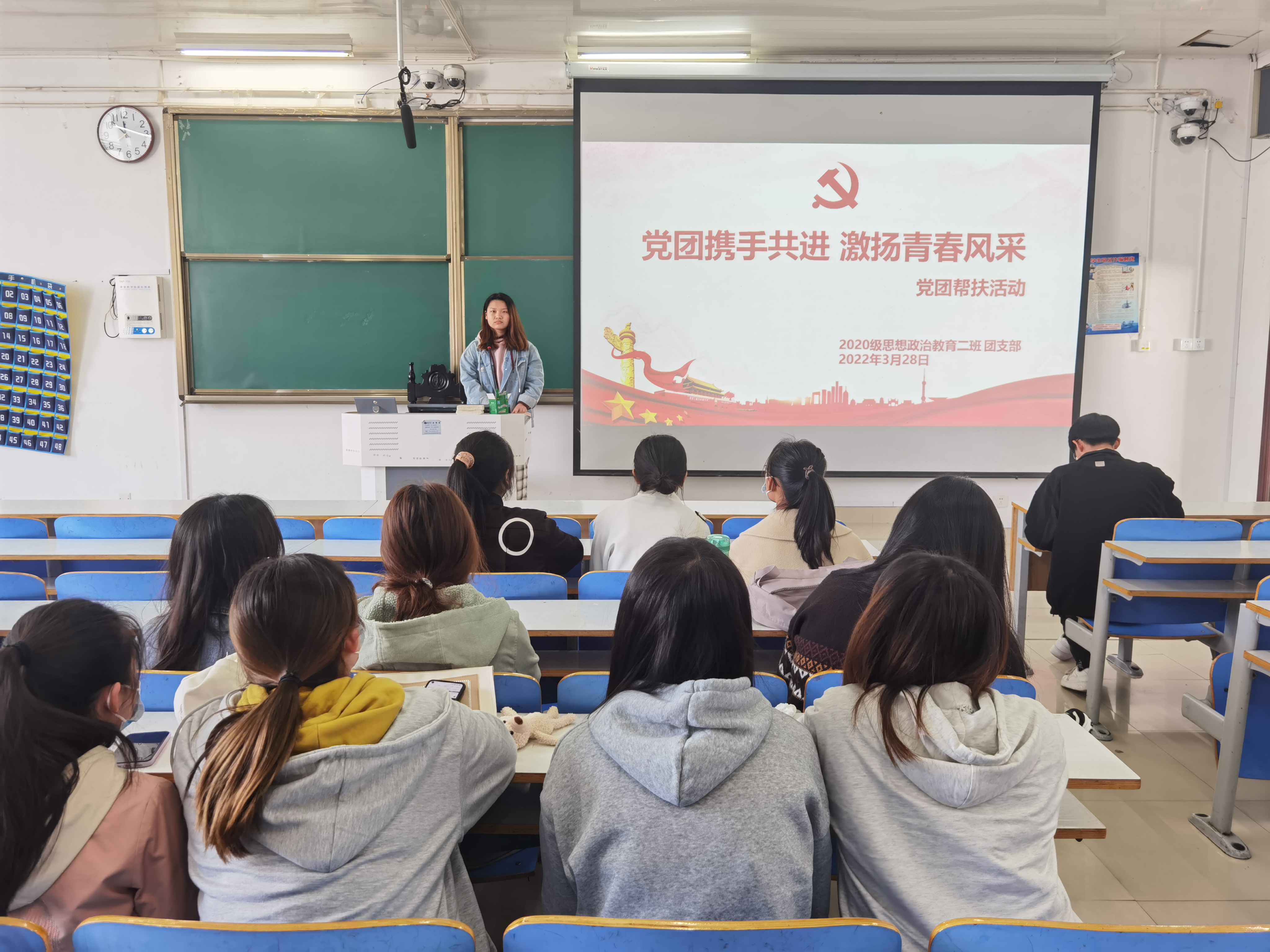 3月28日上午,sjb世俱杯网站2020级思想政治教育二班在社科楼514教室召开“党团携手共进,激扬青春风采”党团帮扶主题班会。2019级预备党员代表王明亮、周永宁及2020级思想政治教育二班全体团员共同参与本次班会。班会由团支书陈宇航主持。