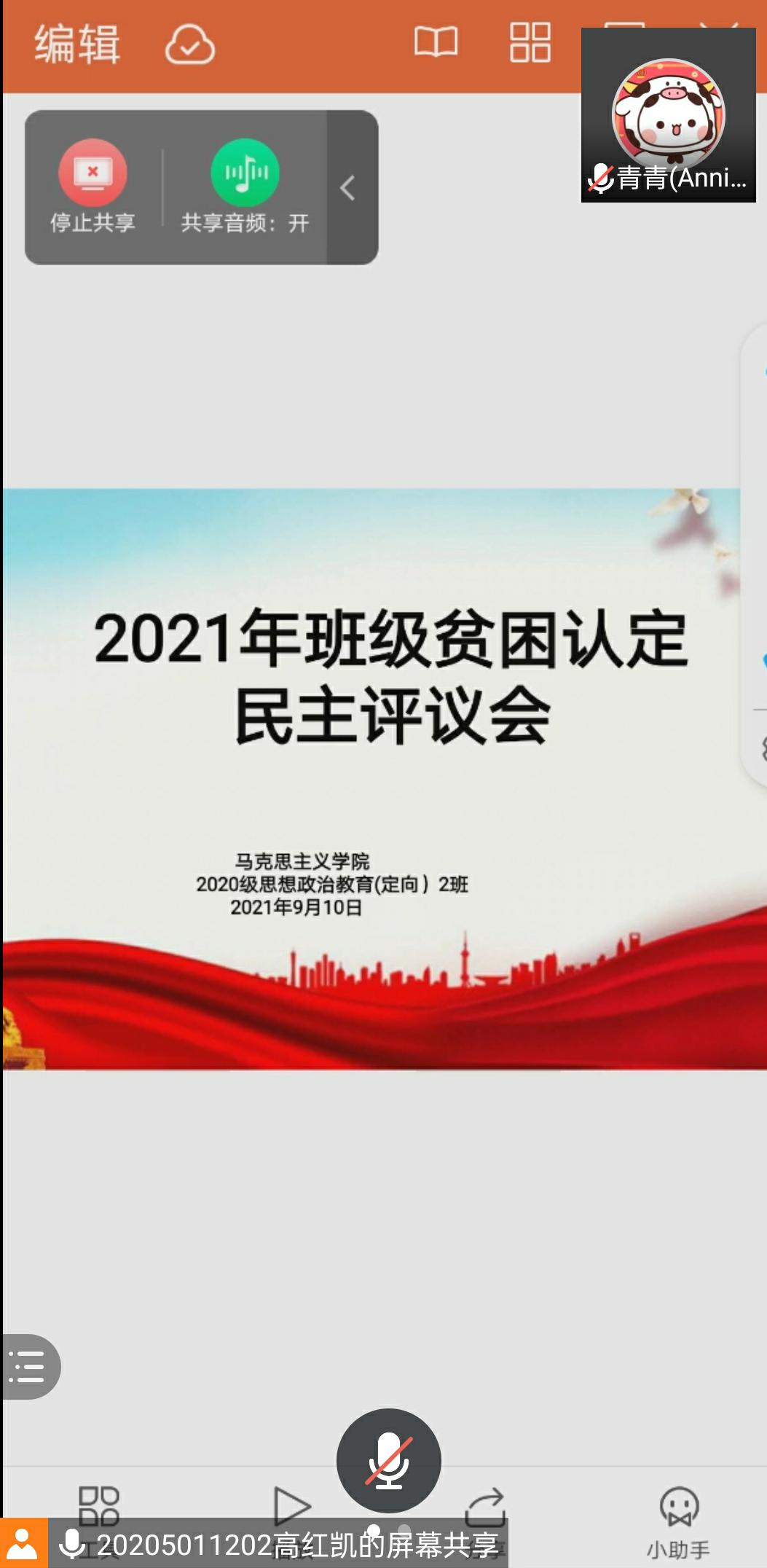 9月10日上午,sjb世俱杯网站2020级思想政治教育定向二班2021年班级贫困认定线上民主评议会通过腾讯会议顺利开展。班主任陶青青出席会议,评议小组全体成员按时到会,世俱杯官网权益保障部监督员宋佳怡全程监督。评议会由班长高红凯主持。