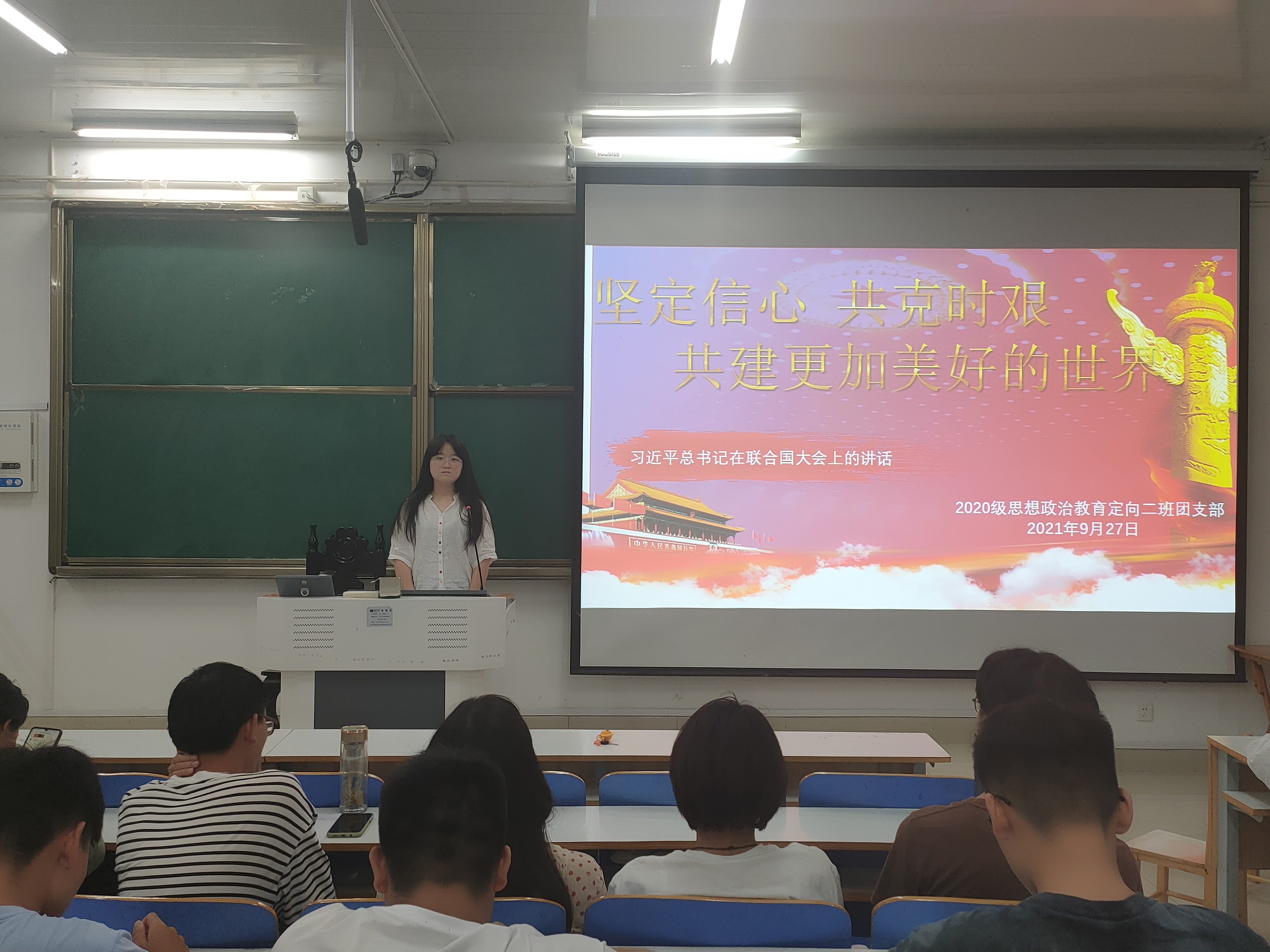 9月27日上午,sjb世俱杯网站2020级思想政治教育二班、定向二班在社科楼514教室顺利开展学习国家主席习近平《坚定信念,共克时艰,共建更加美好的世界》重要讲话精神团支部大会。二班、定向二班全体团员共同参与本次大会。会议由孙毓含主持。