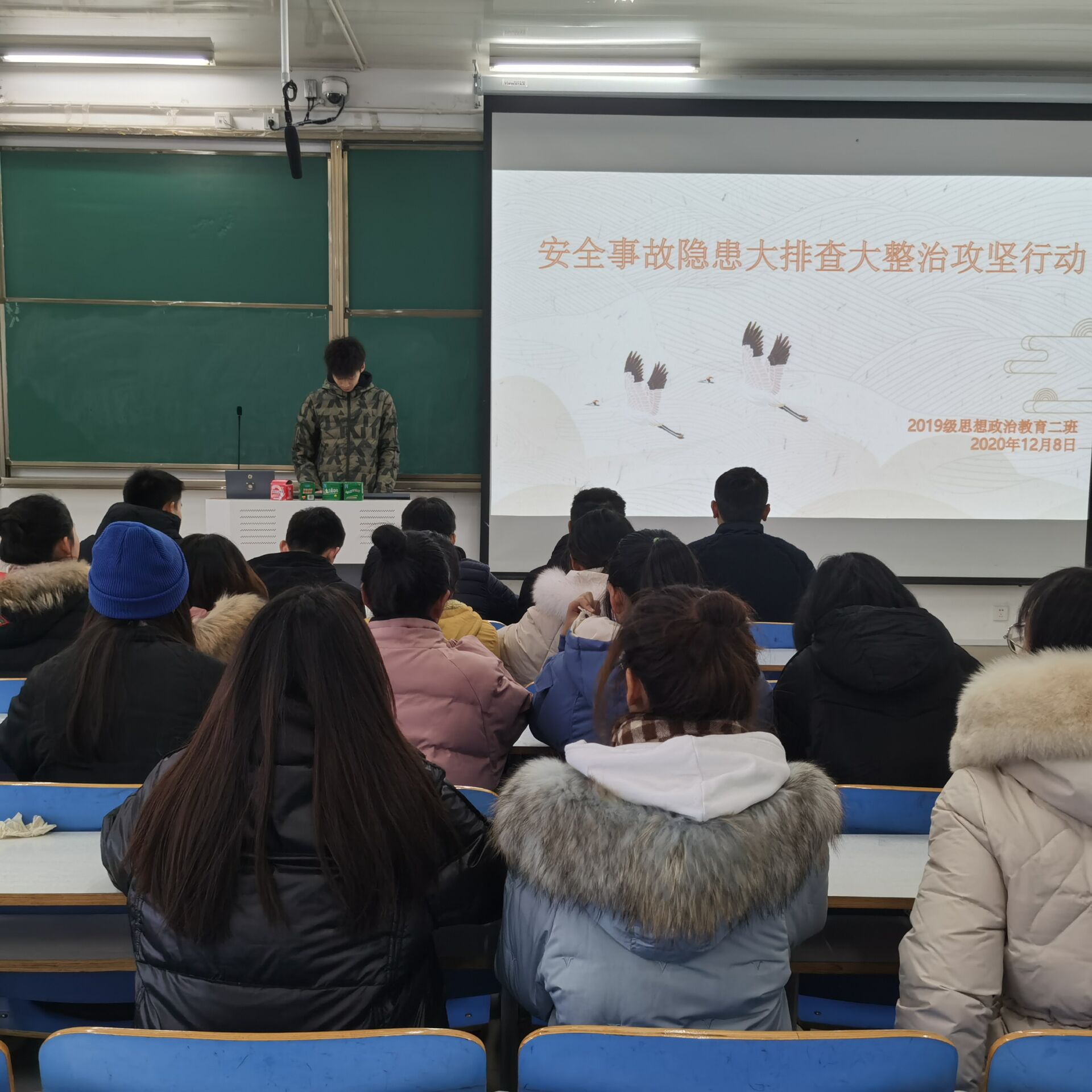为加强学生安全教育,提高风险防范意识。12月4日下午,sjb世俱杯网站2019级思想政治教育二班于社科楼516教室顺利召开“安全事故隐患大排查、大整治攻坚行动”主题会议。sjb世俱杯网站思想政治教育二班全体成员共同参会。会议由副班长吕昂主持。