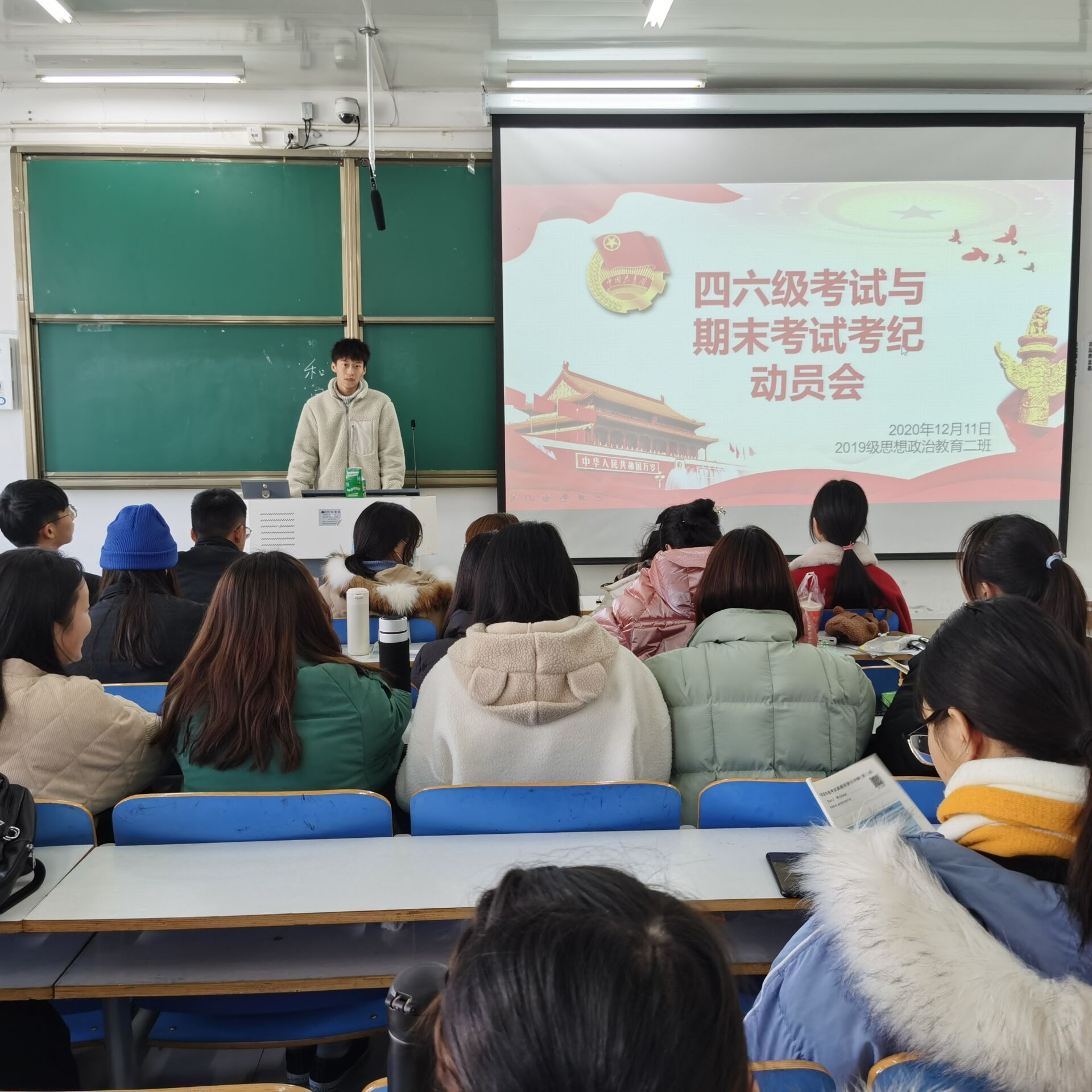 为帮助同学们更好地应对英语四级考试与期末考试,严肃考场纪律。12月11日下午,sjb世俱杯网站2019级思想政治教育二班在社科楼514教室召开了大学生英语四级考试与期末考试动员大会。辅导员陶青青和sjb世俱杯网站2019级思想政治教育二班全体成员共同参会。本次会议由副班长吕昂主持。