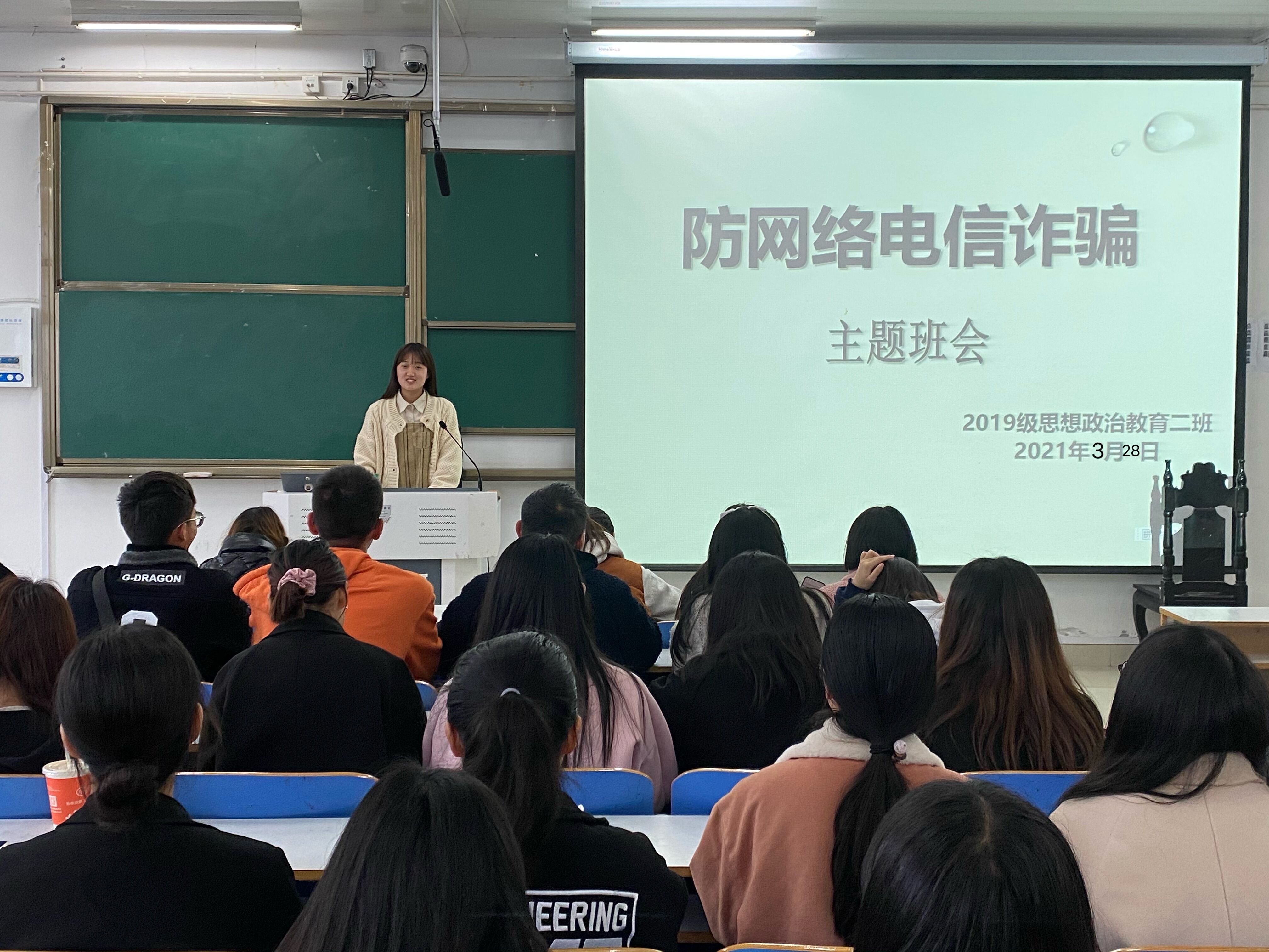 为进一步提升我校大学生网络防诈骗意识,增强防范网络诈骗能力,3月28日上午,世俱杯官网2019级思想政治教育二班在社科楼516教室召开“防网络电信诈骗”主题会议。2019级思想政治教育二班全体成员共同参会。会议由团支书孙雅娴主持。